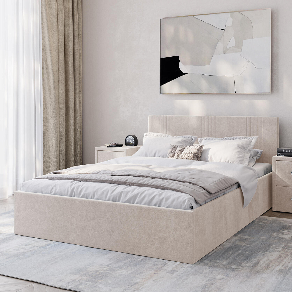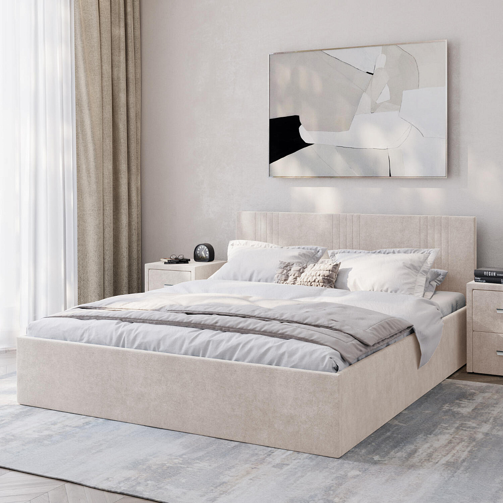 Кровать «Элис» выполнена в мягкой обивке из практичного и износостойкого велюра. Прямая спинка украшена декоративной стежкой, добавляющей стиля и динамики в интерьер. Просторный бельевой короб станет удобным местом для хранения вещей и освободит место в шкафу. Надёжное основание и анатомическая решётка на подъёмных газлифтах обеспечат оптимальный уровень комфорта во время сна.