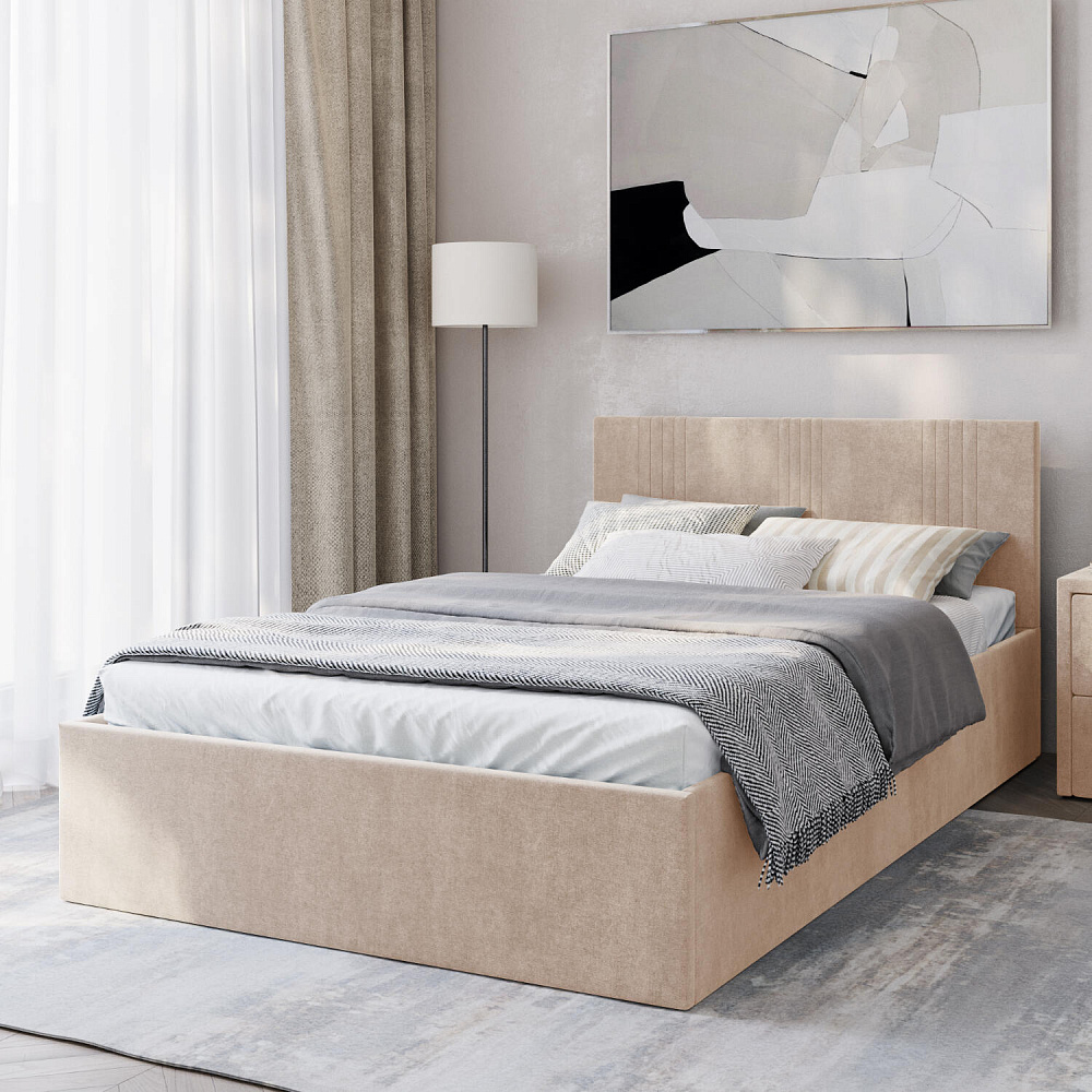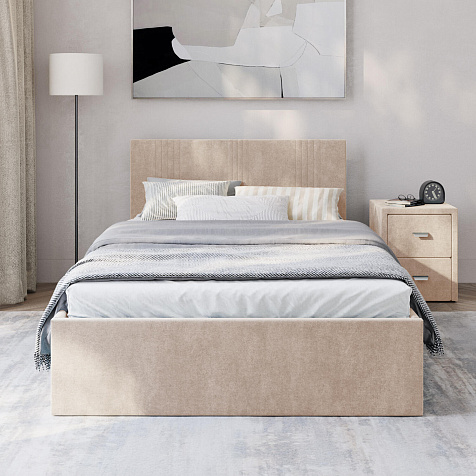 Кровать «Элис» выполнена в мягкой обивке из практичного и износостойкого велюра. Прямая спинка украшена декоративной стежкой, добавляющей стиля и динамики в интерьер. Просторный бельевой короб станет удобным местом для хранения вещей и освободит место в шкафу. Надёжное основание и анатомическая решётка на подъёмных газлифтах обеспечат оптимальный уровень комфорта во время сна.
