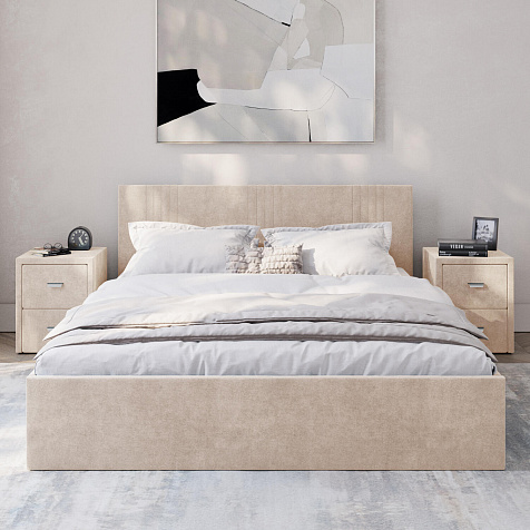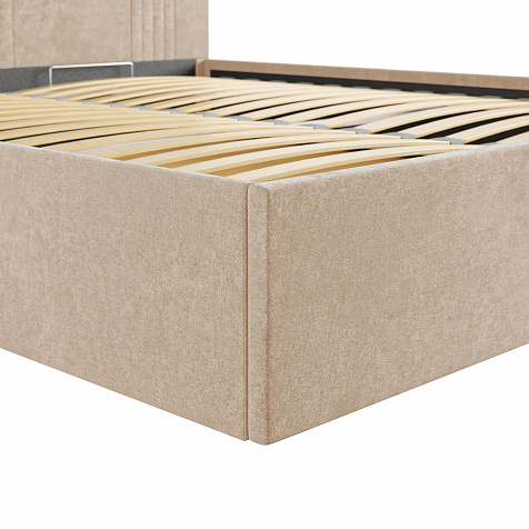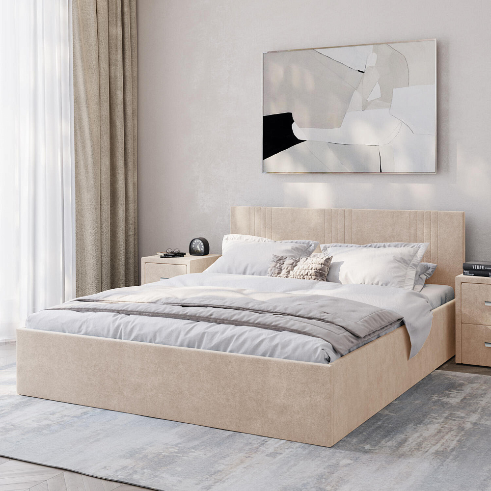 Кровать «Элис» выполнена в мягкой обивке из практичного и износостойкого велюра. Прямая спинка украшена декоративной стежкой, добавляющей стиля и динамики в интерьер. Просторный бельевой короб станет удобным местом для хранения вещей и освободит место в шкафу. Надёжное основание и анатомическая решётка на подъёмных газлифтах обеспечат оптимальный уровень комфорта во время сна.
