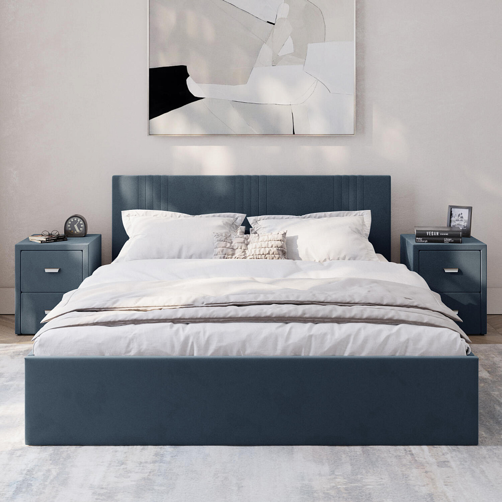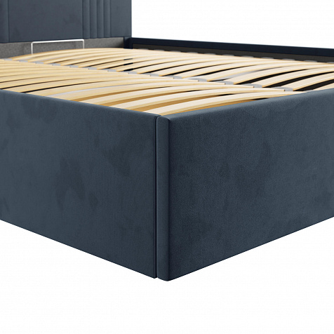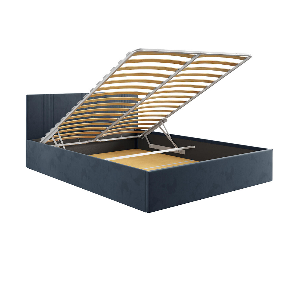 Кровать «Элис» выполнена в мягкой обивке из практичного и износостойкого велюра. Прямая спинка украшена декоративной стежкой, добавляющей стиля и динамики в интерьер. Просторный бельевой короб станет удобным местом для хранения вещей и освободит место в шкафу. Надёжное основание и анатомическая решётка на подъёмных газлифтах обеспечат оптимальный уровень комфорта во время сна.