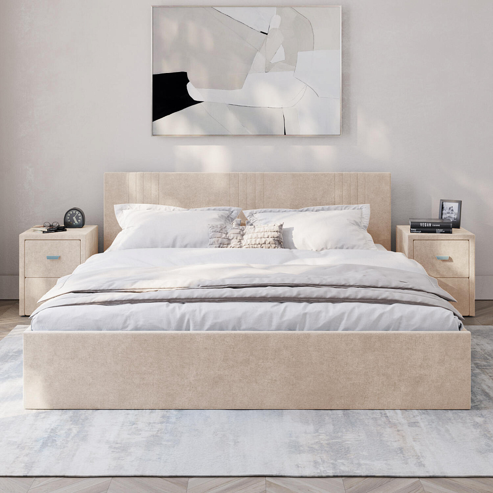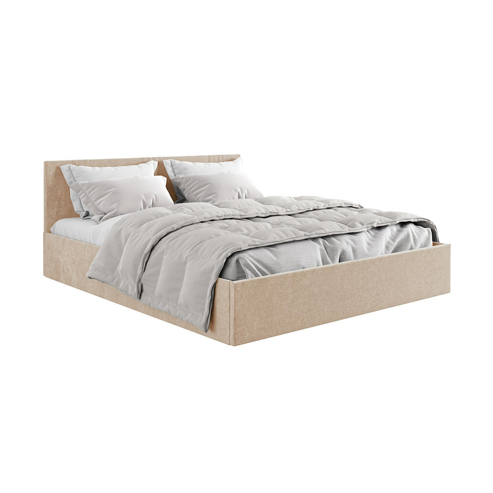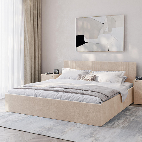 Кровать «Элис» выполнена в мягкой обивке из практичного и износостойкого велюра. Прямая спинка украшена декоративной стежкой, добавляющей стиля и динамики в интерьер. Просторный бельевой короб станет удобным местом для хранения вещей и освободит место в шкафу. Надёжное основание и анатомическая решётка на подъёмных газлифтах обеспечат оптимальный уровень комфорта во время сна.