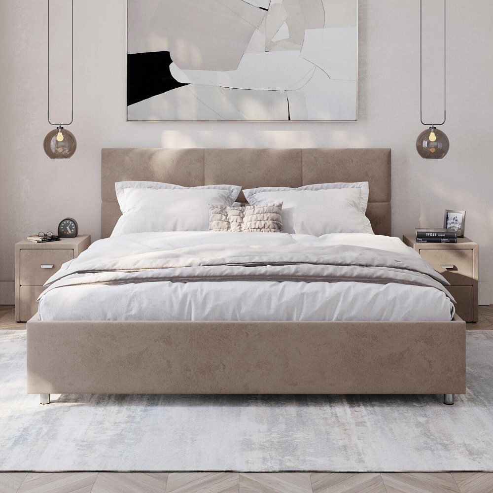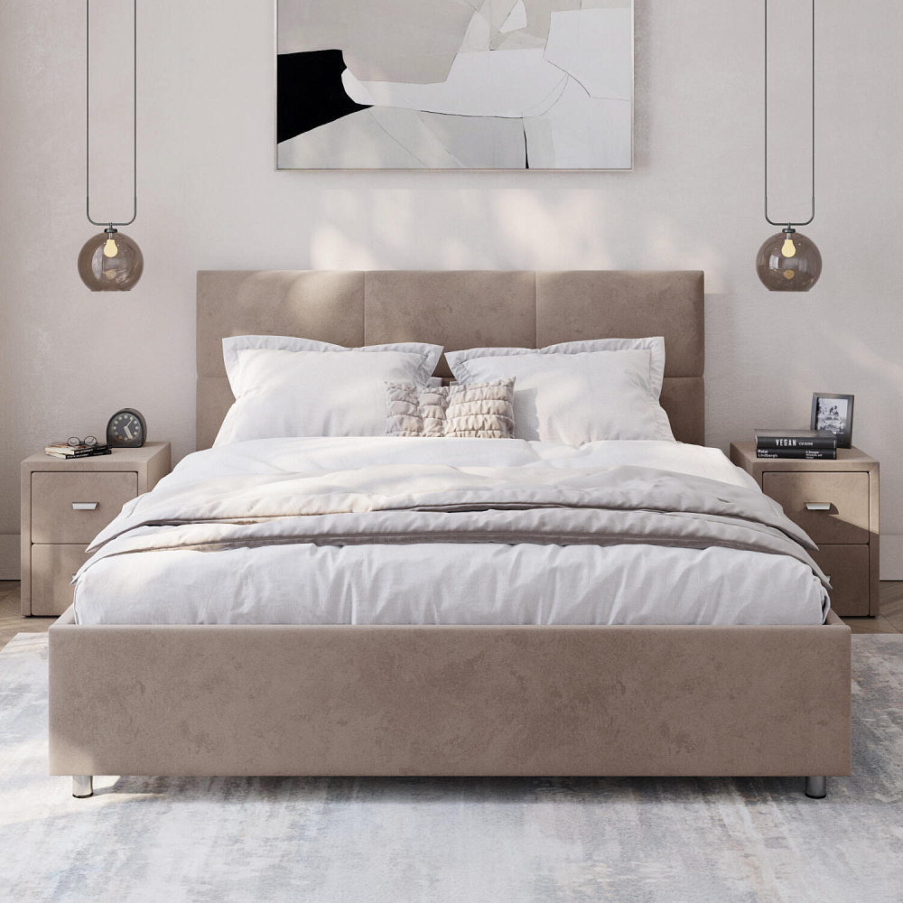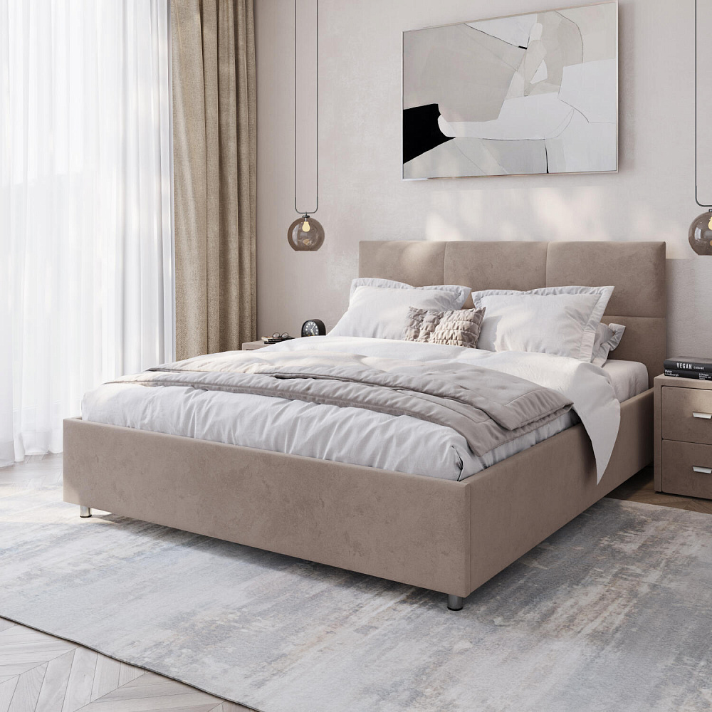 Кровать «Альба» — гармоничное сочетание стильного дизайна и комфорта. Мягкое изголовье с декором в виде прямоугольной строчки выглядит эффектно и создаёт ощущение уюта. Модель также поможет сэкономить пространство спальни благодаря вместительному бельевому коробу под решёткой.
