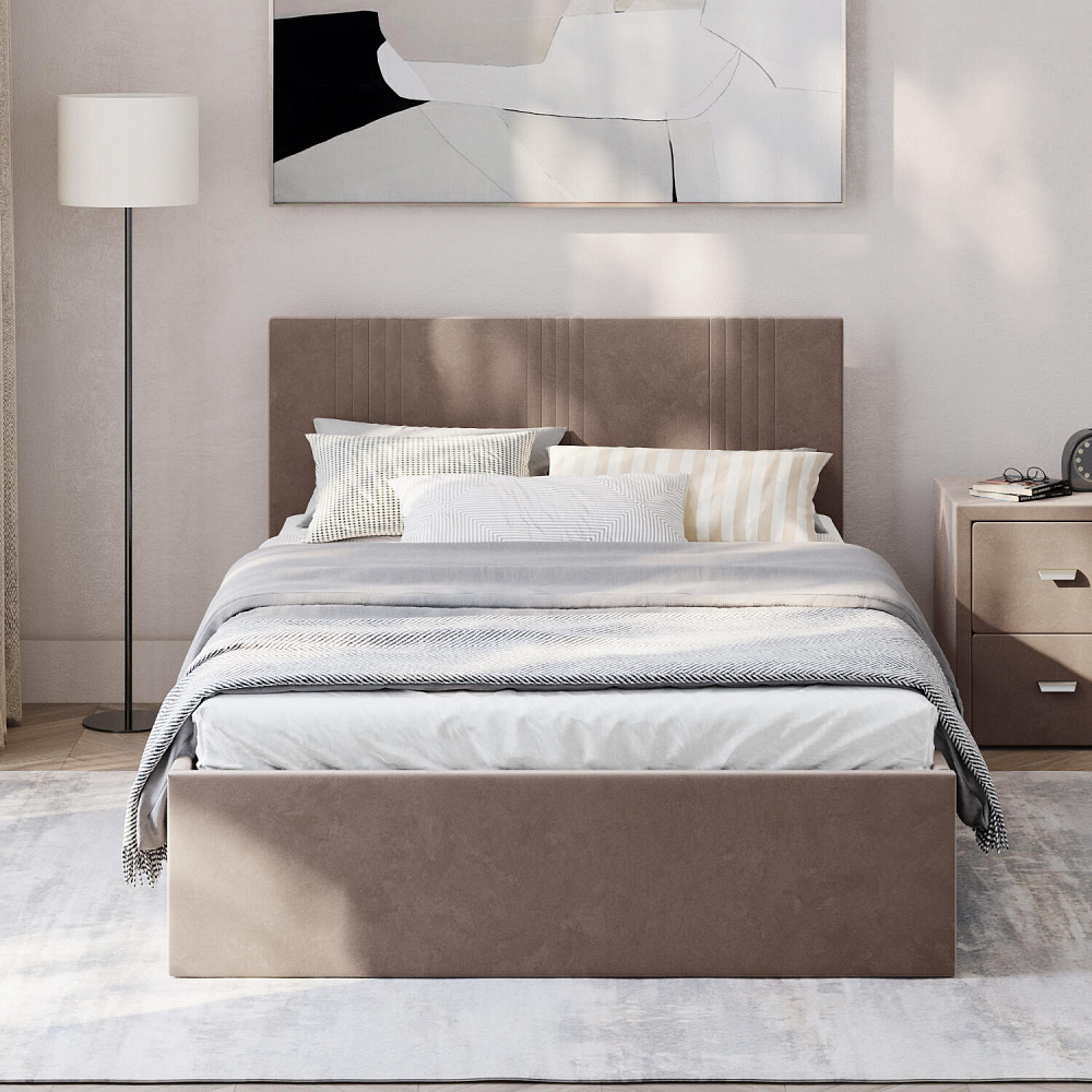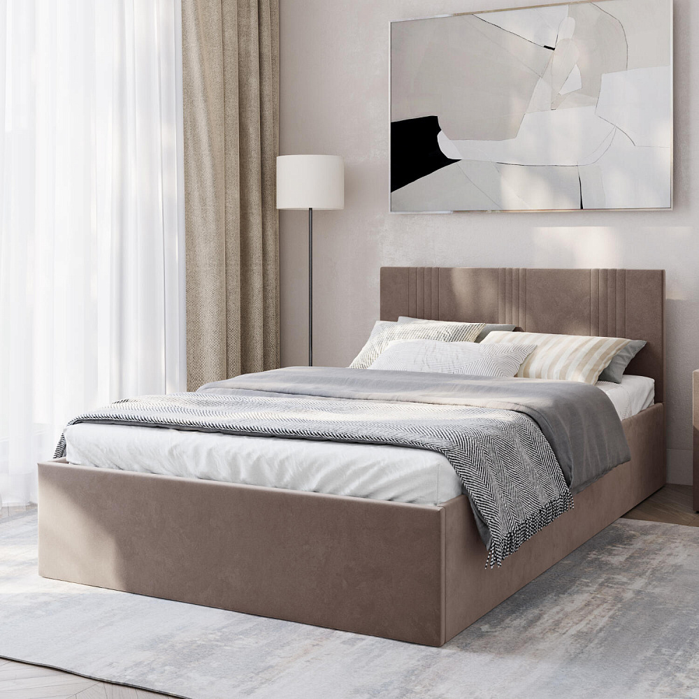 Кровать «Элис» выполнена в мягкой обивке из практичного и износостойкого велюра. Прямая спинка украшена декоративной стежкой, добавляющей стиля и динамики в интерьер. Особо прочный бельевой ящик позволит хранить в кровати даже самые тяжелые предметы и вещи. Надёжное основание и анатомическая решётка на подъёмных газлифтах обеспечат оптимальный уровень комфорта во время сна.