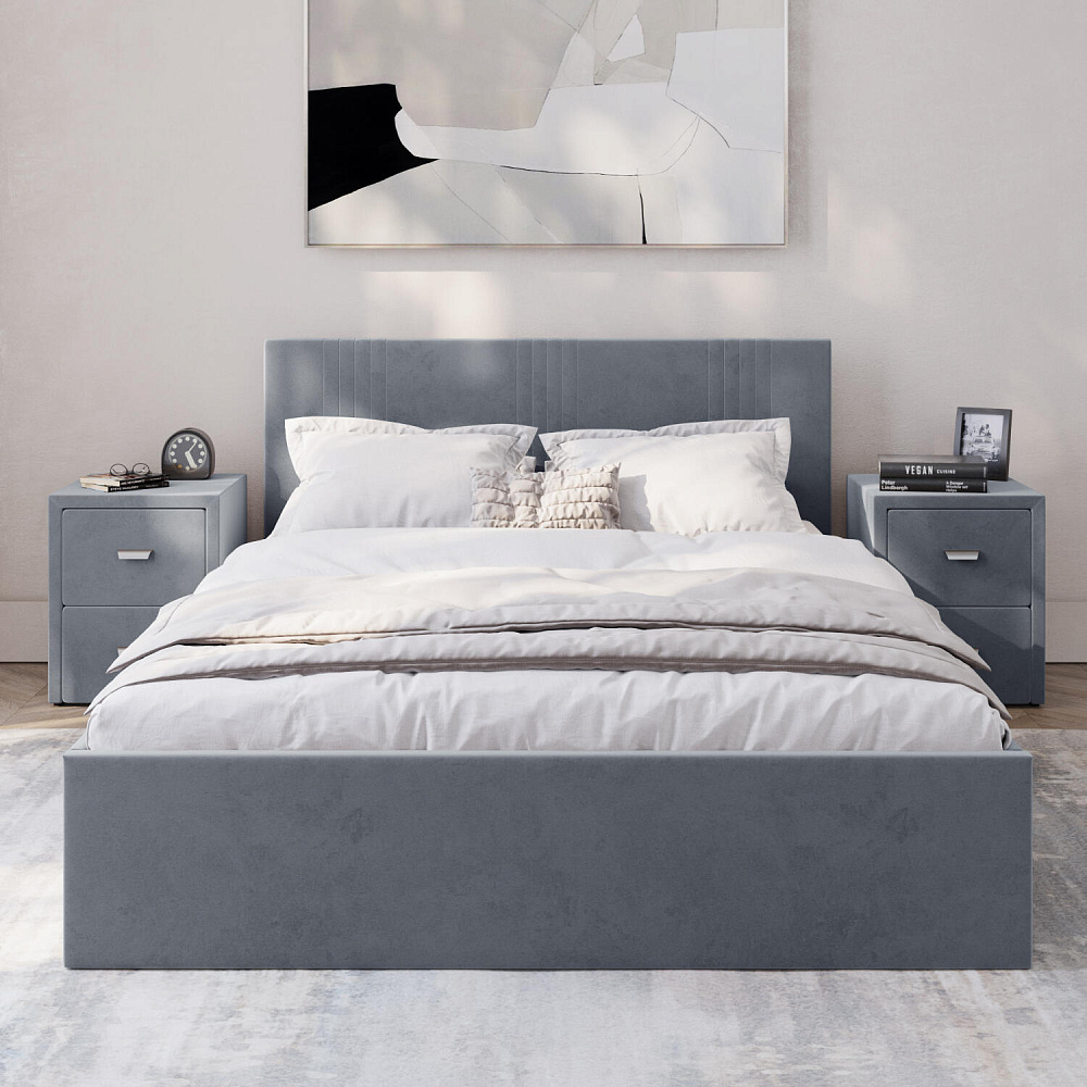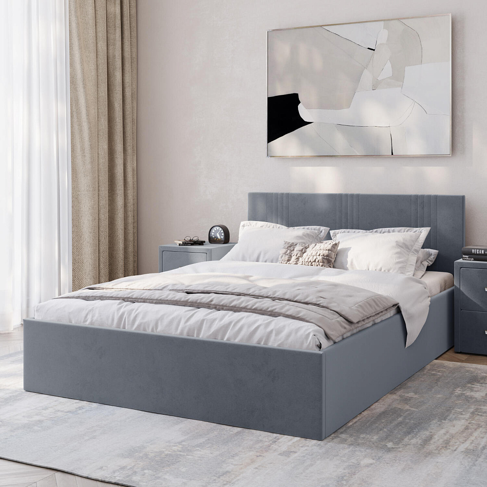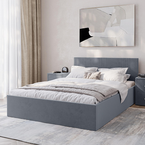 Кровать «Элис» выполнена в мягкой обивке из практичного и износостойкого велюра. Прямая спинка украшена декоративной стежкой, добавляющей стиля и динамики в интерьер. Особо прочный бельевой ящик позволит хранить в кровати даже самые тяжелые предметы и вещи. Надёжное основание и анатомическая решётка на подъёмных газлифтах обеспечат оптимальный уровень комфорта во время сна.