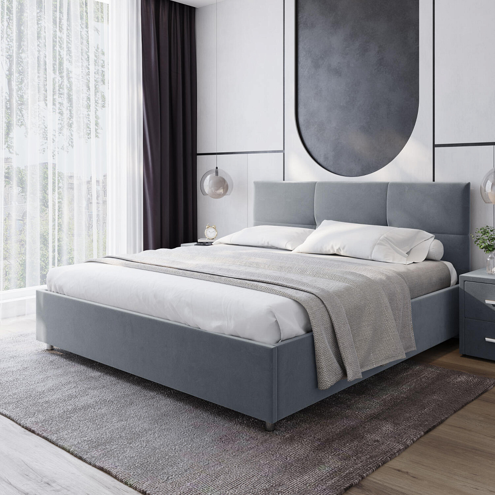 Кровать «Альба» — гармоничное сочетание стильного дизайна и комфорта. Мягкое изголовье с декором в виде прямоугольной строчки выглядит эффектно и создаёт ощущение уюта. Модель также поможет сэкономить пространство спальни благодаря вместительному бельевому коробу под решёткой.
