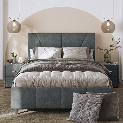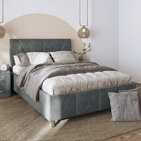 Мягкая кровать «Каролина» для тех, кому важен здоровый сон и эстетичный вид мебели. Дизайн отличается диагональными и прямыми строчками и слегка изогнутым изголовьем. Возвышение на ножках добавит в интерьер динамики и лёгкости. Кровать также поможет сэкономить пространство квартиры благодаря вместительному бельевому коробу под решёткой.