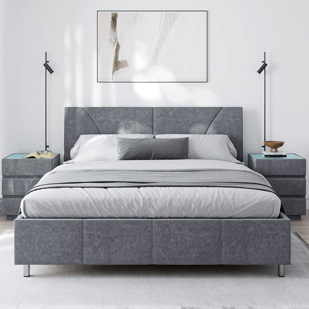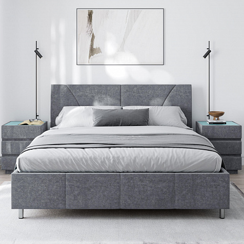 Мягкая кровать «Каролина» для тех, кому важен здоровый сон и эстетичный вид мебели. Дизайн отличается диагональными и прямыми строчками и слегка изогнутым изголовьем. Возвышение на ножках добавит в интерьер динамики и лёгкости. Кровать также поможет сэкономить пространство квартиры благодаря вместительному бельевому коробу под решёткой.