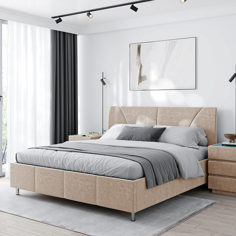 Мягкая кровать «Каролина» для тех, кому важен здоровый сон и эстетичный вид мебели. Дизайн отличается диагональными и прямыми строчками и слегка изогнутым изголовьем. Возвышение на ножках добавит в интерьер динамики и лёгкости. Кровать также поможет сэкономить пространство квартиры благодаря вместительному бельевому коробу под решёткой.
