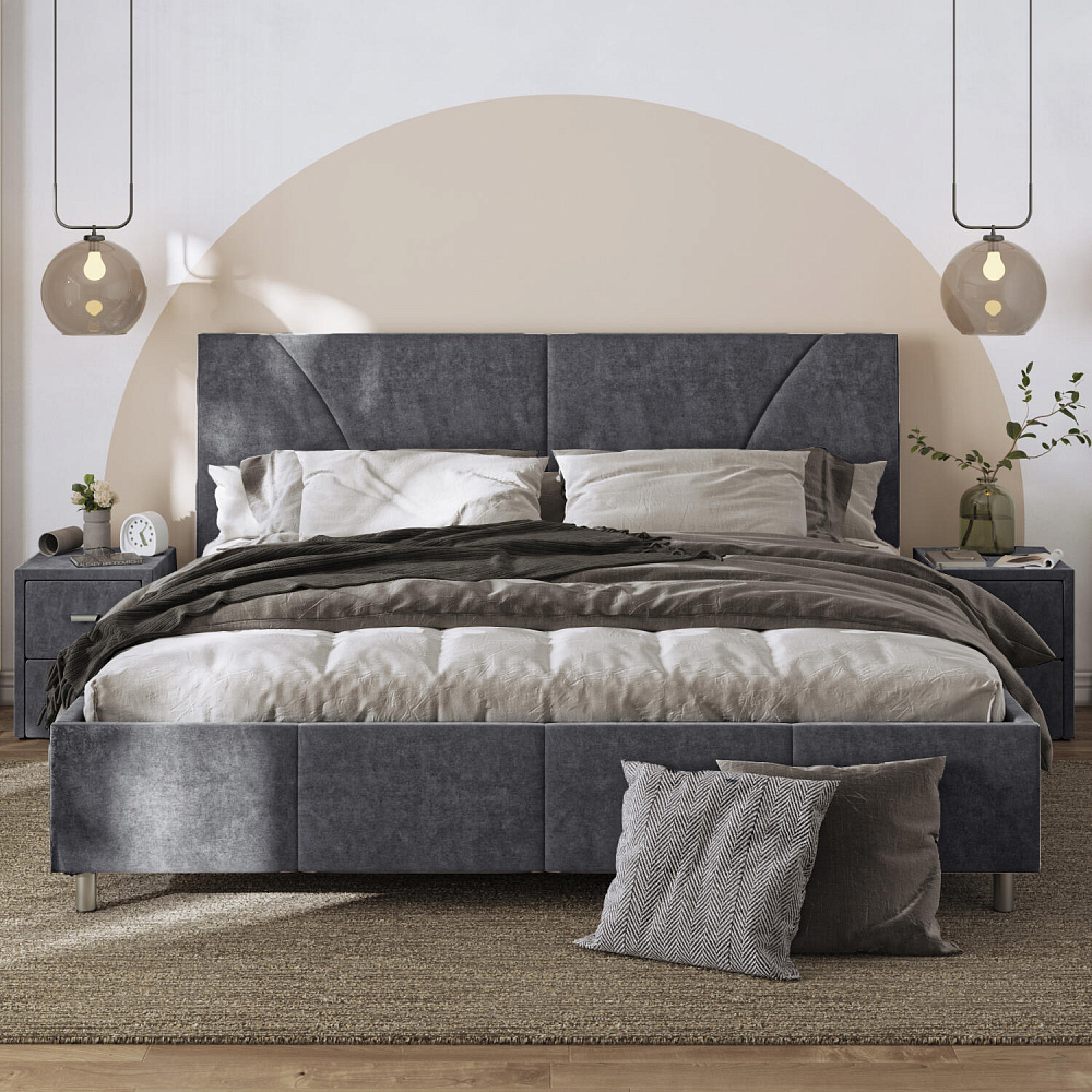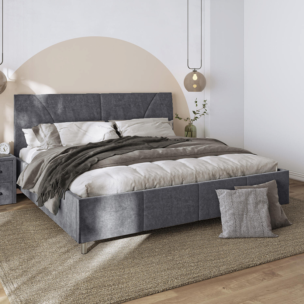 Мягкая кровать «Каролина» для тех, кому важен здоровый сон и эстетичный вид мебели. Дизайн отличается диагональными и прямыми строчками и слегка изогнутым изголовьем. Возвышение на ножках добавит в интерьер динамики и лёгкости. Кровать также поможет сэкономить пространство квартиры благодаря вместительному бельевому коробу под решёткой.