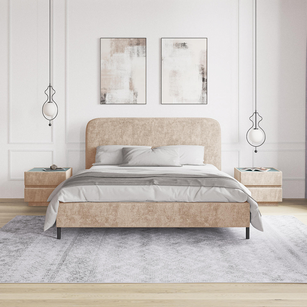 Высокие металлические опоры — стильный акцент в дизайне кровати, который придает ей визуальную легкость и невесомость.