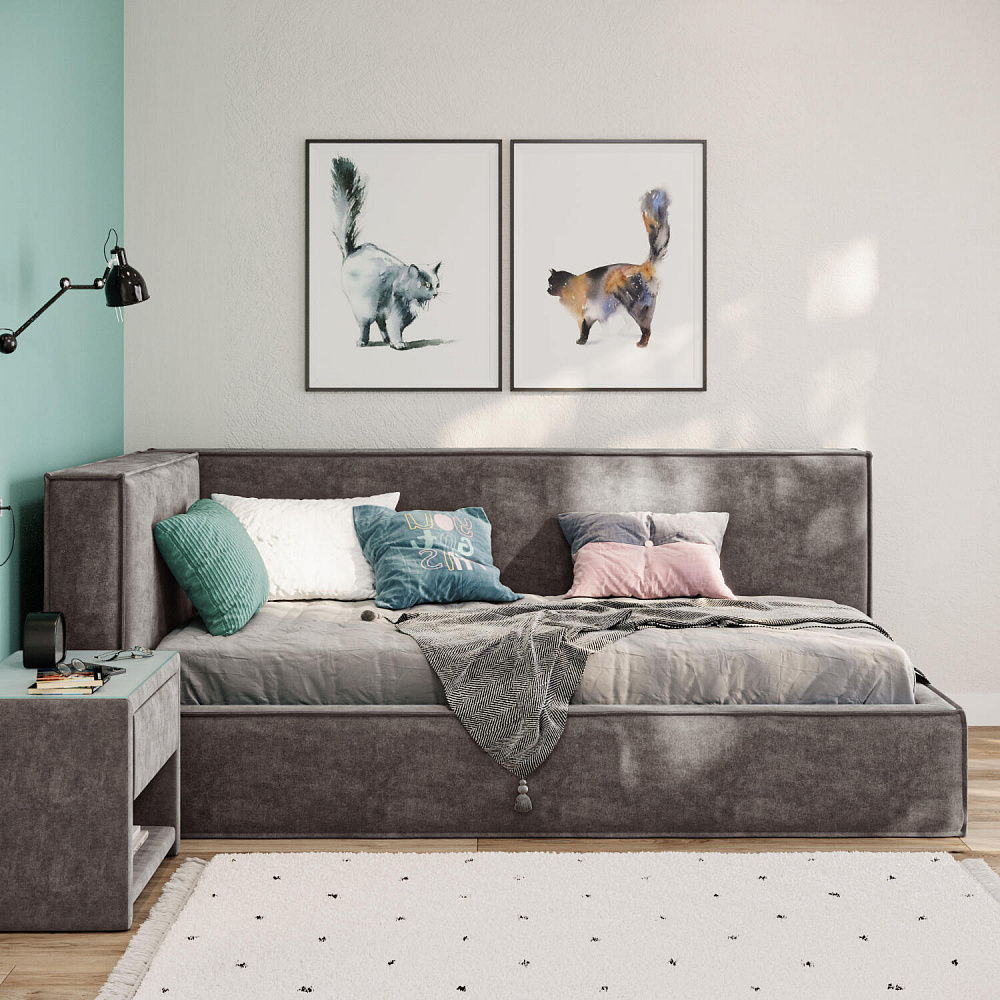 - Дизайн на 360 градусов. Кровать выполнена в основной обивочной ткани со всех сторон.