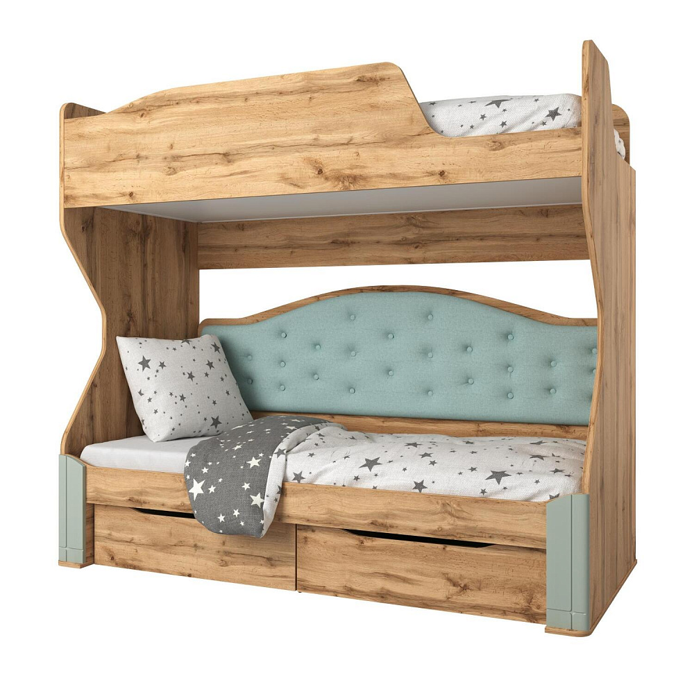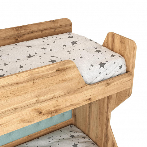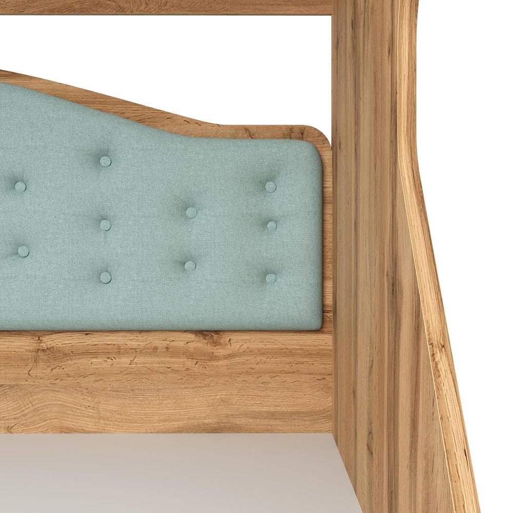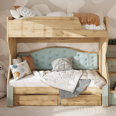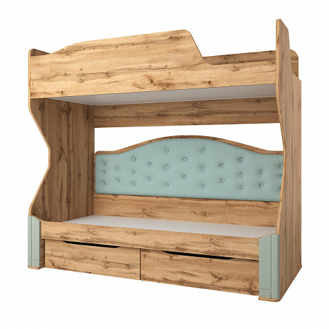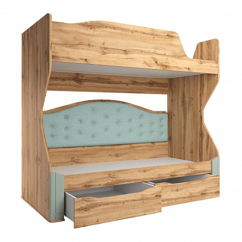 Двухъярусная кровать «Кассия» займёт центральное место в интерьере детской. Приятное сочетание эвкалиптовых элементов, древесного декора панелей наполнит пространство комнаты светом и теплом. Продуманные размеры верхнего и нижнего спального места при наличии удобных матрасов обеспечат максимально спокойный и полезный отдых ваших детей, а выдвижные ящики помогут компактно разместить постельное бельё.