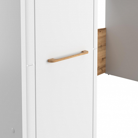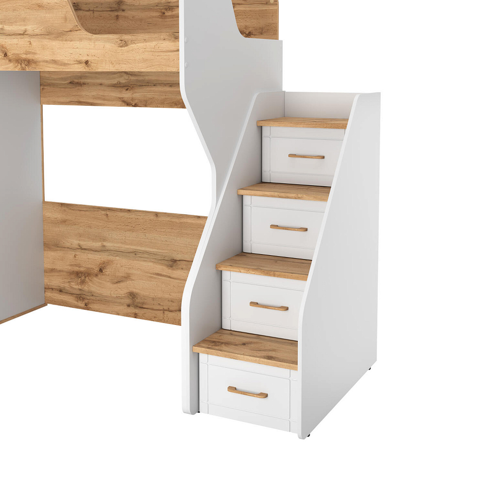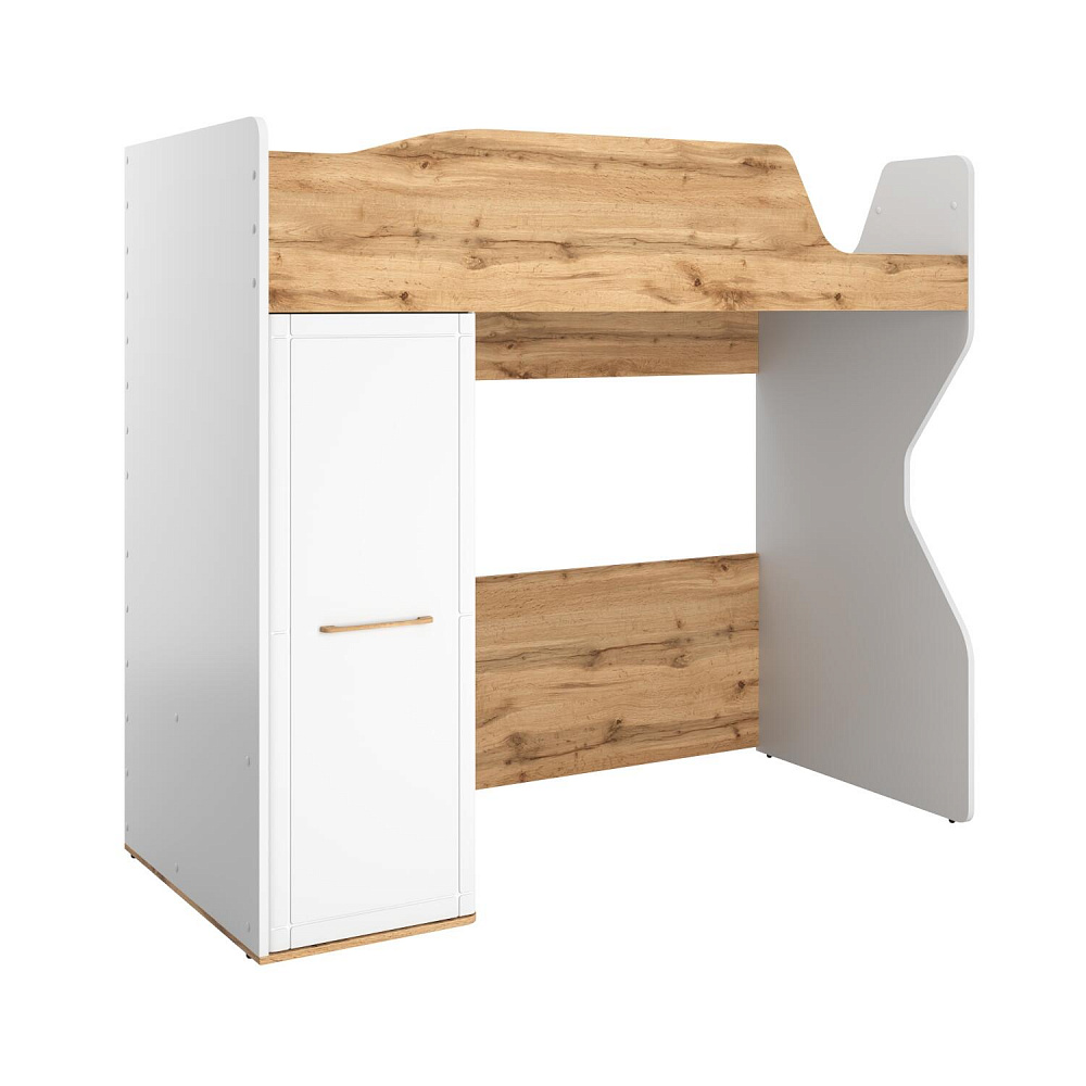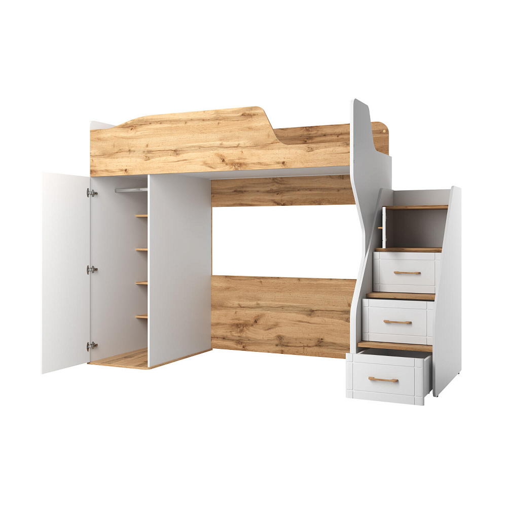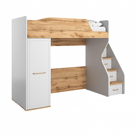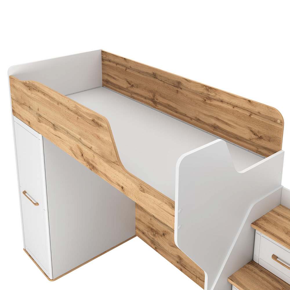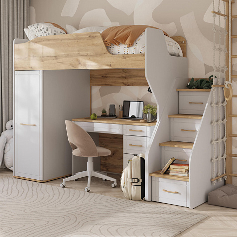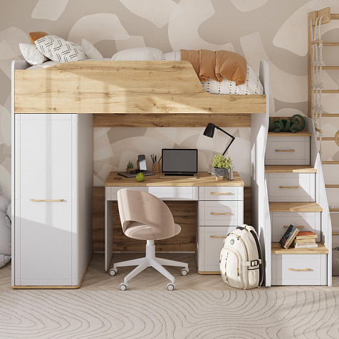 Кровать-чердак с удобной системой хранения понравится как детям, так и их родителям. Приятное сочетание белых стенок и древесного декора панелей наполнит пространство комнаты светом и теплом. Продуманные размеры спального места при наличии удобного матраса обеспечат максимально спокойный и полезный отдых вашего ребёнка. Функциональный модуль значительно освободит место в комнате для игр и активных занятий.