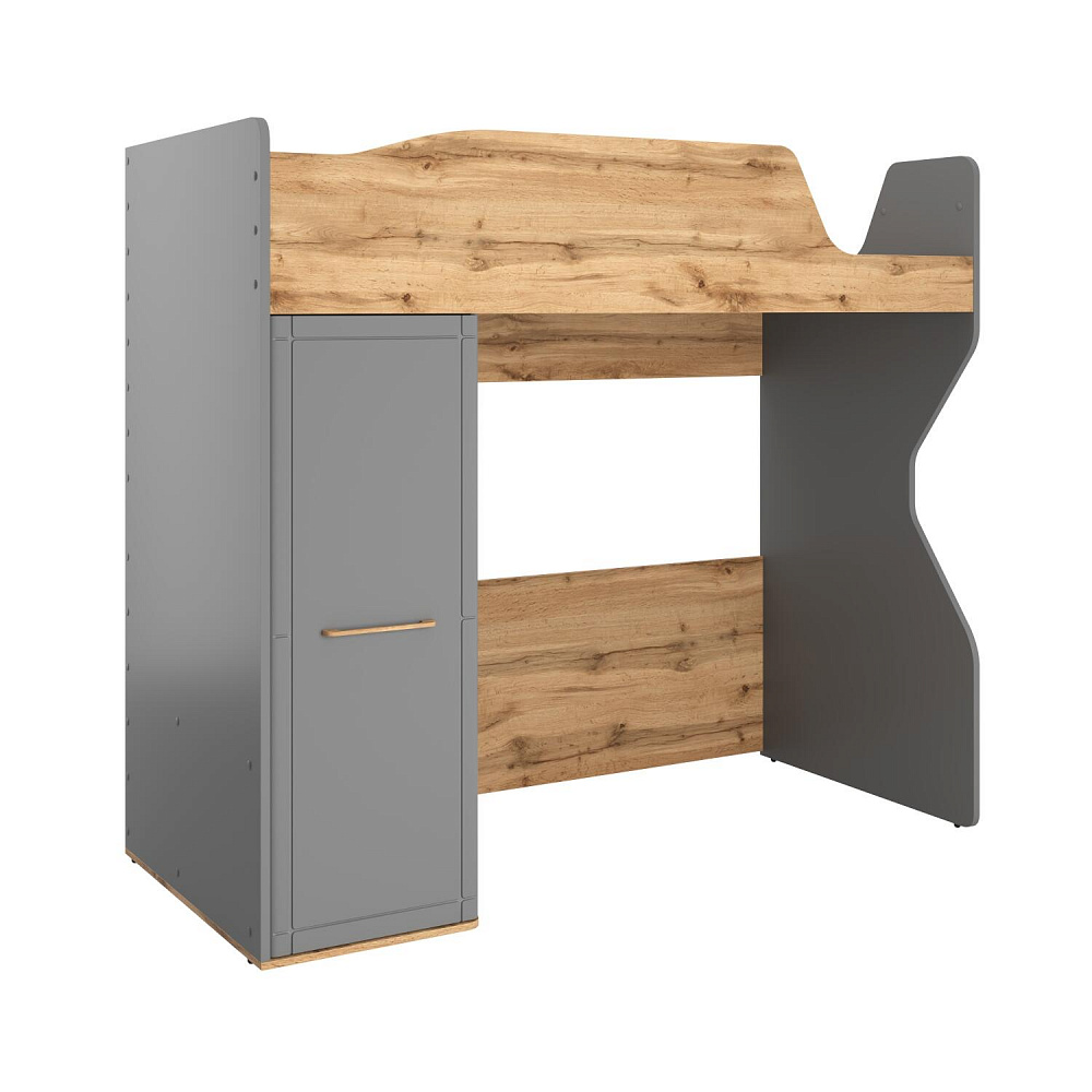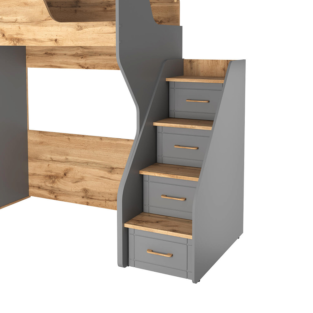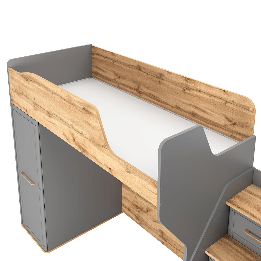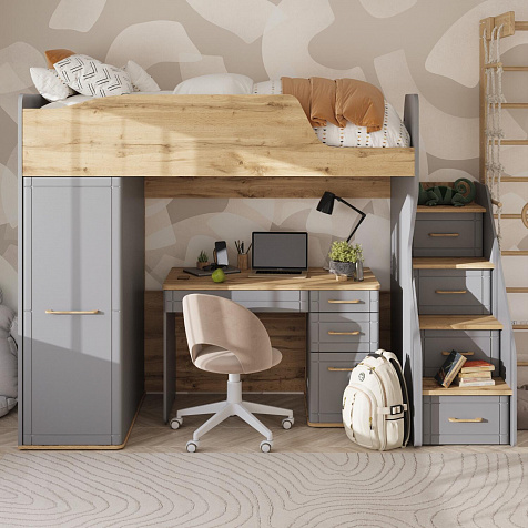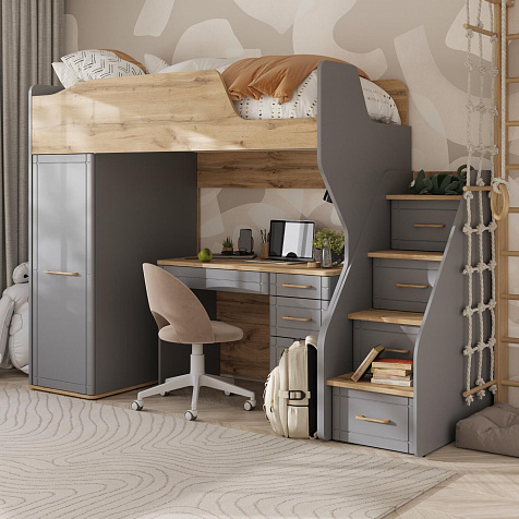 Кровать-чердак с удобной системой хранения понравится как детям, так и их родителям. Приятное сочетание серых стенок и древесного декора панелей наполнит пространство комнаты светом и теплом. Продуманные размеры спального места при наличии удобного матраса обеспечат максимально спокойный и полезный отдых вашего ребёнка. Функциональный модуль значительно освободит место в комнате для игр и активных занятий.