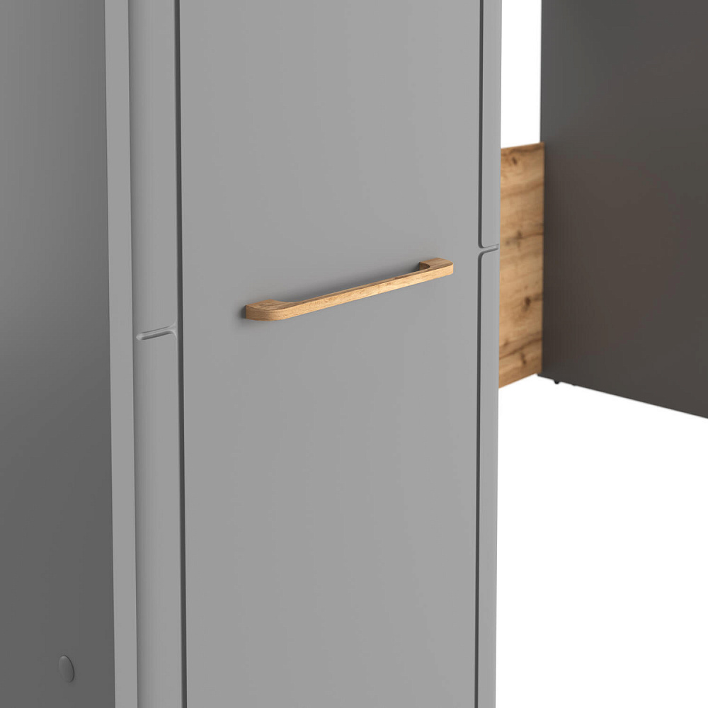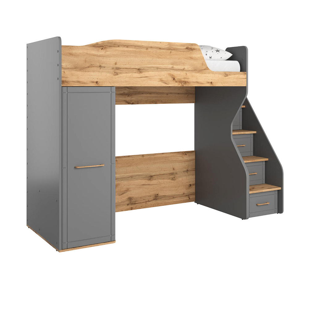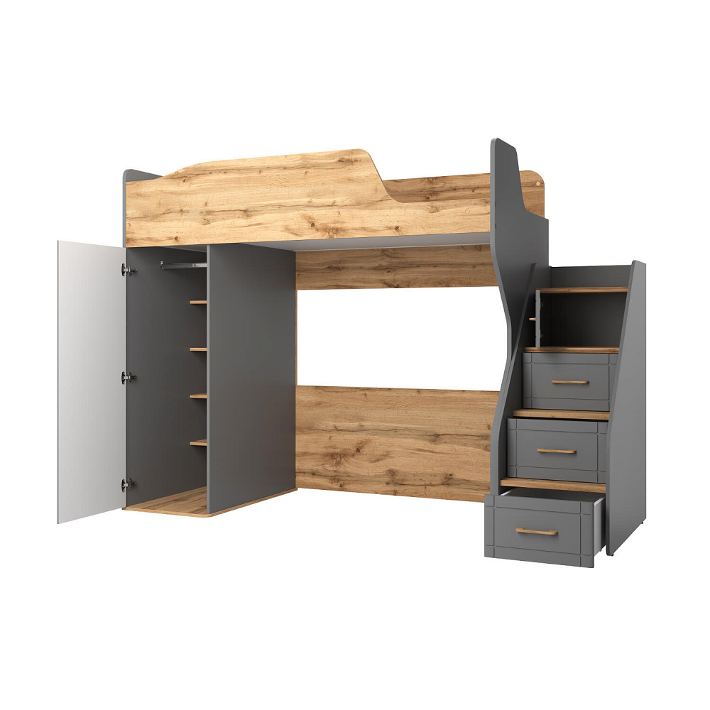 Кровать-чердак с удобной системой хранения понравится как детям, так и их родителям. Приятное сочетание серых стенок и древесного декора панелей наполнит пространство комнаты светом и теплом. Продуманные размеры спального места при наличии удобного матраса обеспечат максимально спокойный и полезный отдых вашего ребёнка. Функциональный модуль значительно освободит место в комнате для игр и активных занятий.