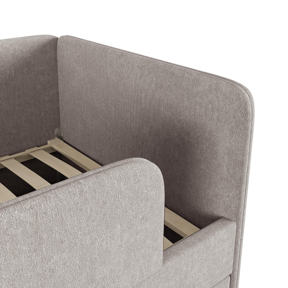 Обивка из плотного велюра Grain. Тонкое тиснение, напоминающее перекрученную косичку, добавляет кровати мягкость и объём, визуально смягчает контуры.