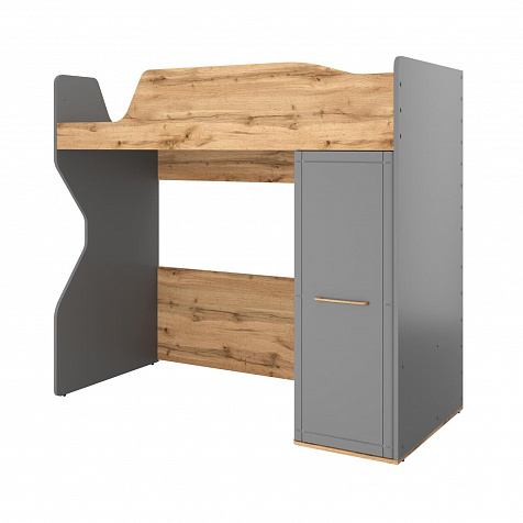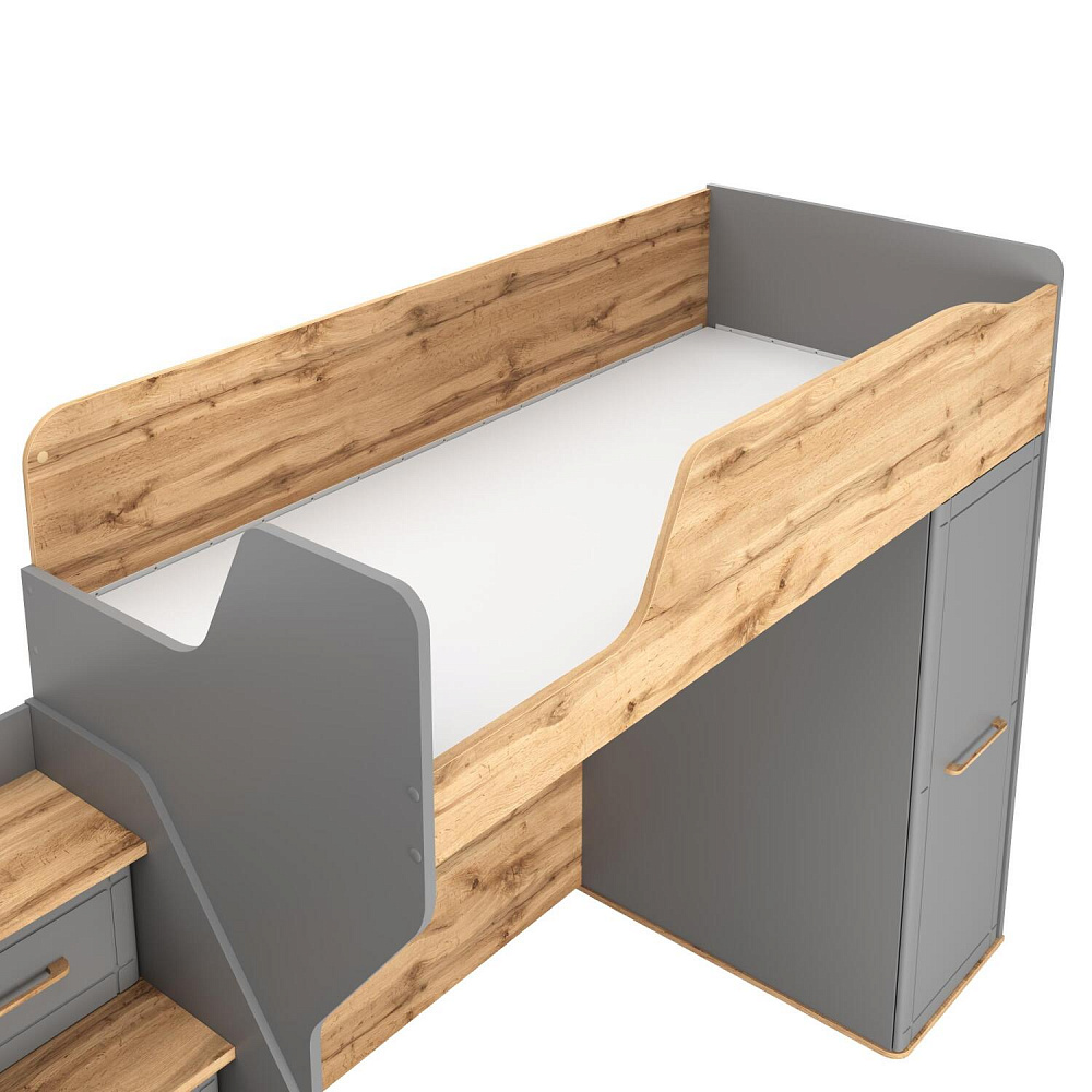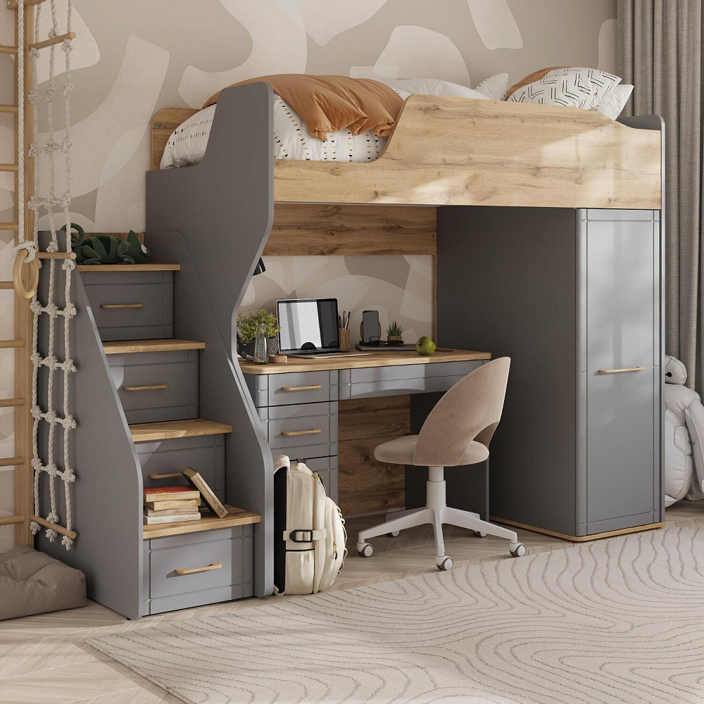Кровать-чердак с удобной системой хранения понравится как детям, так и их родителям. Приятное сочетание серых стенок и древесного декора панелей наполнит пространство комнаты светом и теплом. Продуманные размеры спального места при наличии удобного матраса обеспечат максимально спокойный и полезный отдых вашего ребёнка. Функциональный модуль значительно освободит место в комнате для игр и активных занятий.