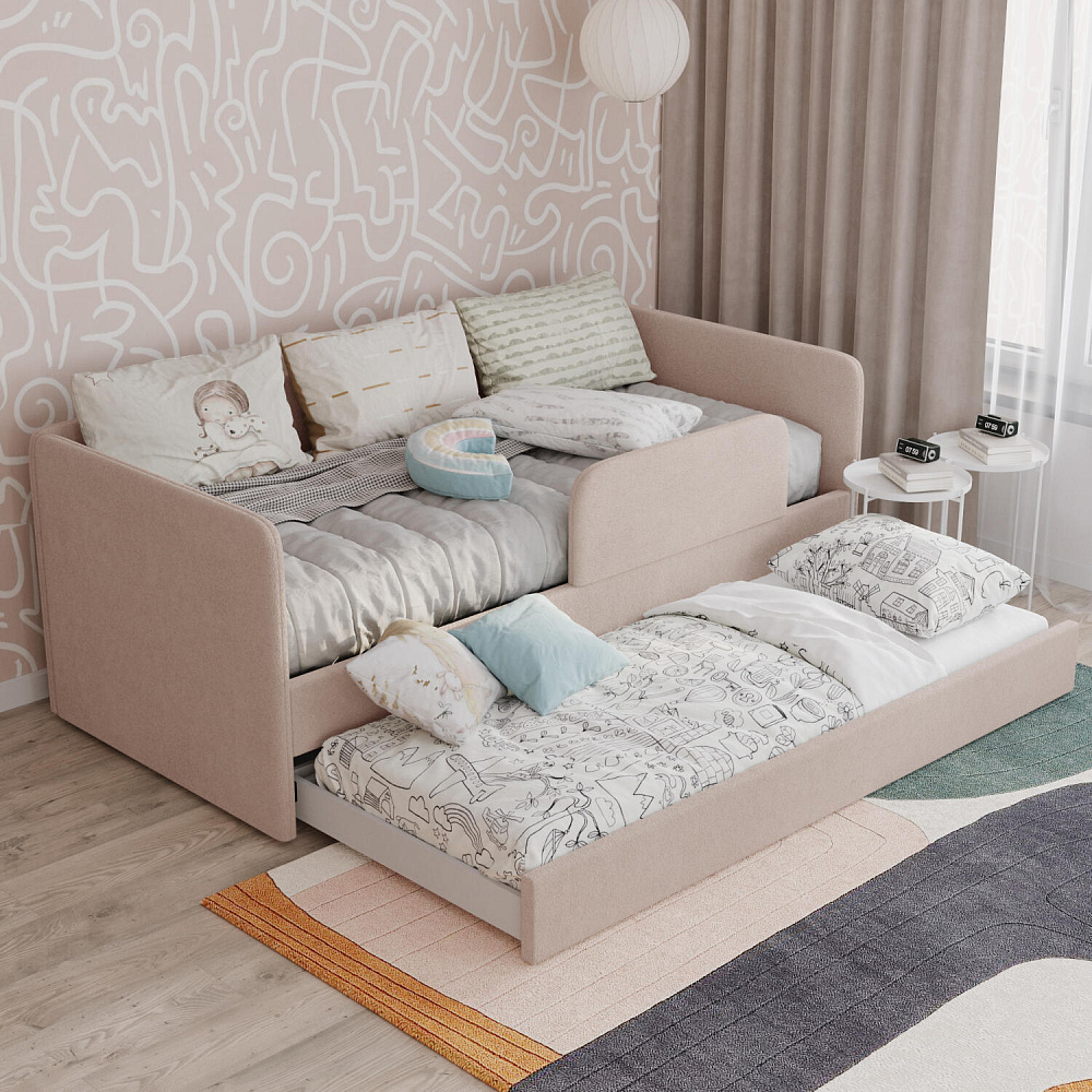 Мягкая кровать «Венди» непременно станет центром детской комнаты. Главная особенность кровати — это выдвижной короб, который можно дополнить матрасом и использовать как второе спальное место. Конструкция 2-в-1 сэкономит пространство в комнате, а удобные размеры спальных мест обеспечат максимально спокойный и полезный отдых ваших детей.