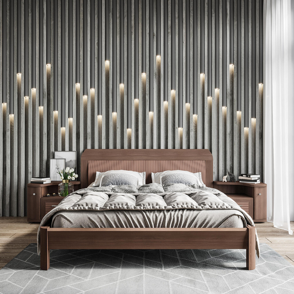 Изголовье: профиль МДФ со вставкой из изогнутой панели с декоративным покрытием из бамбука.