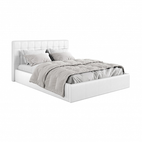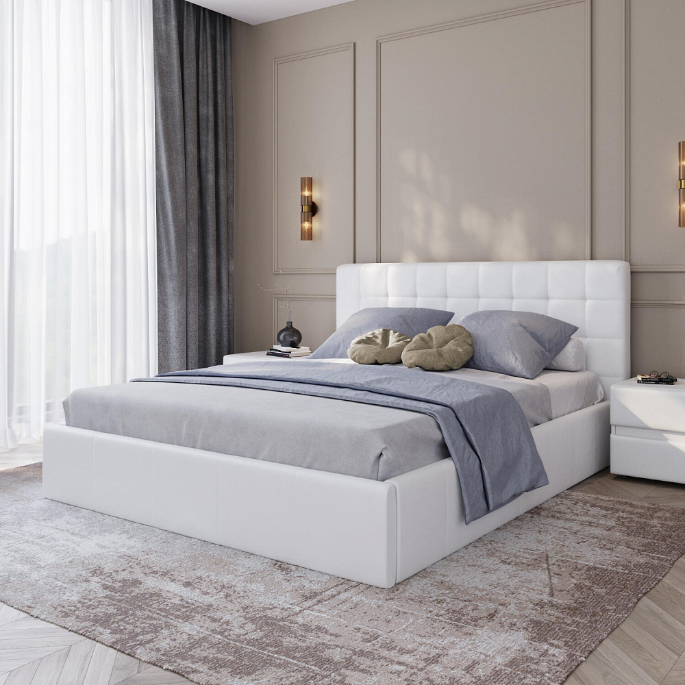 Мягкая кровать с высокой спинкой, оформленной ненавязчивой стяжкой, понравится любителям уютных, но лаконичных идей для своего дома. Для обивки этой модели используется высококачественная экокожа.