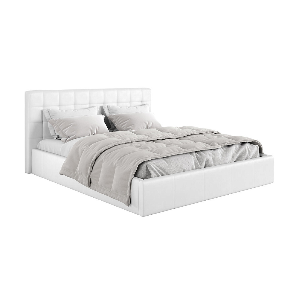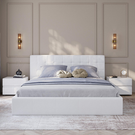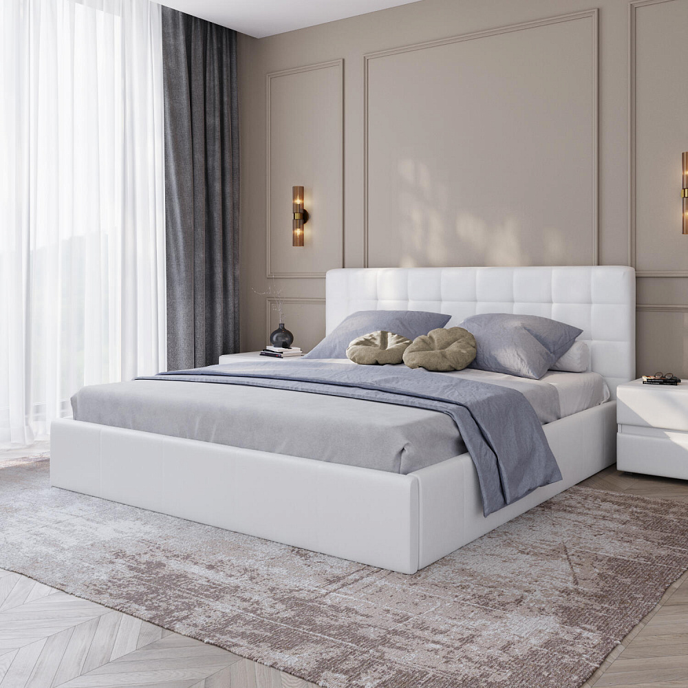 Мягкая кровать с высокой спинкой, оформленной ненавязчивой стяжкой, понравится любителям уютных, но лаконичных идей для своего дома. Для обивки этой модели используется высококачественная экокожа.