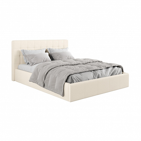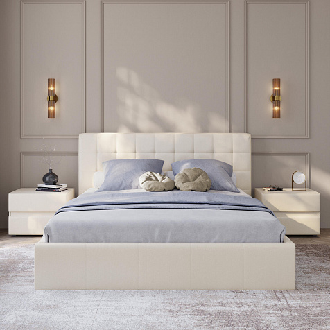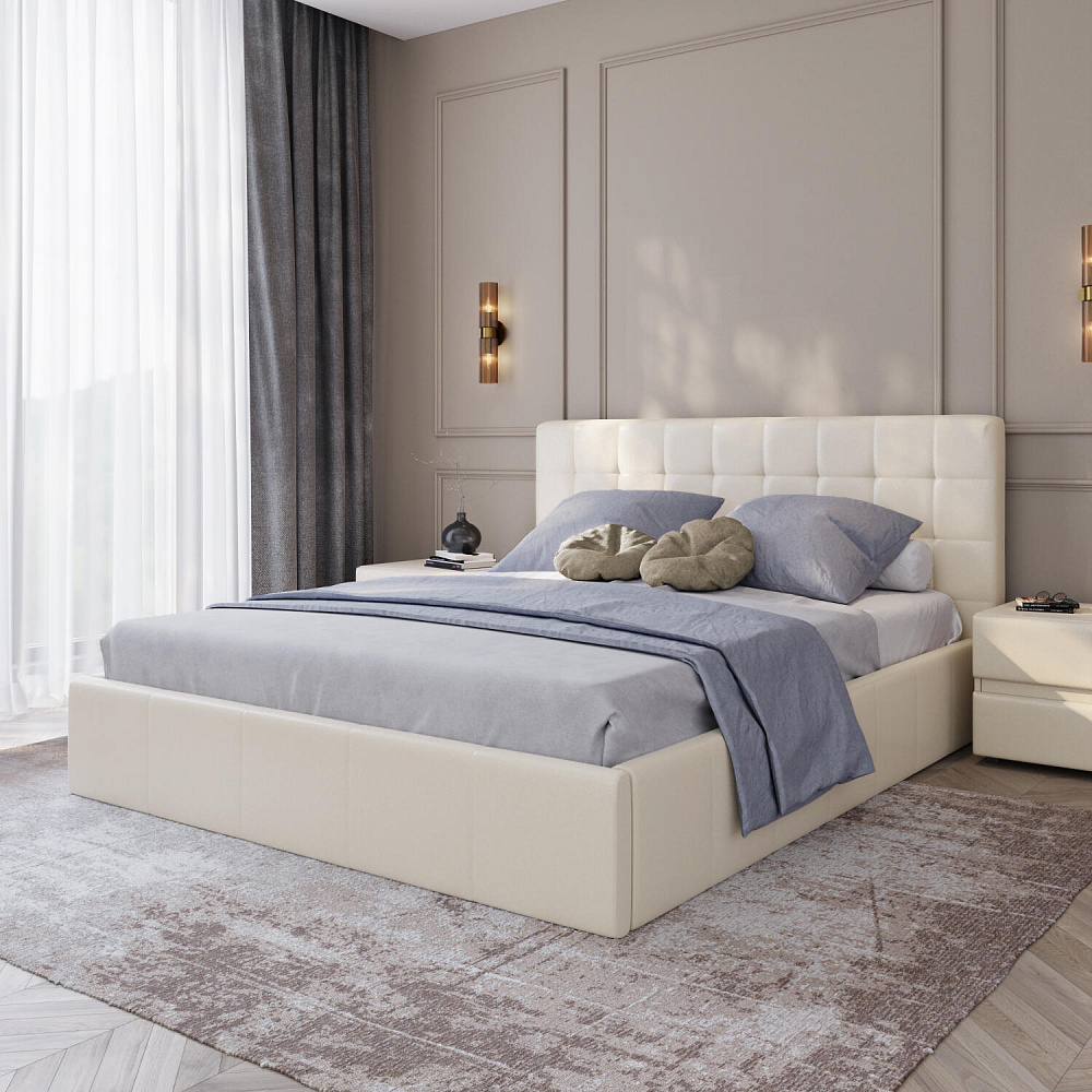 Мягкая кровать с высокой спинкой, оформленной ненавязчивой стяжкой, понравится любителям уютных, но лаконичных идей для своего дома. Для обивки этой модели используется высококачественная экокожа.