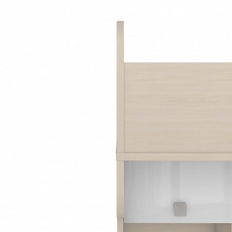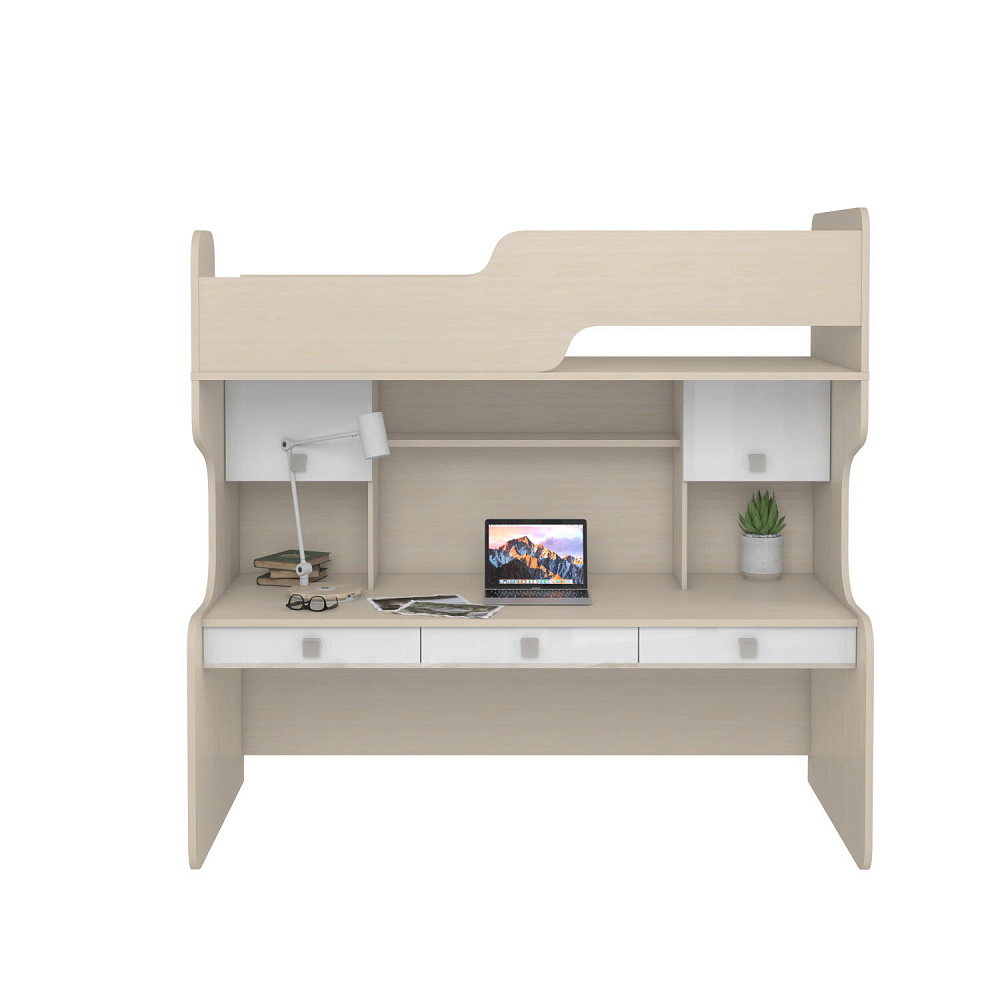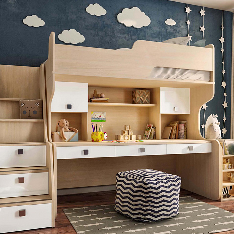 Продуманная двухместная рабочая зона с системой хранения. Под кроватью есть просторная столешница с отверстием для проводов, три выдвижных ящика, два шкафа и открытые полки. Рабочее место будет удобно как для одного, так и для двоих детей, места хватит всем учебным материалам и канцелярии.