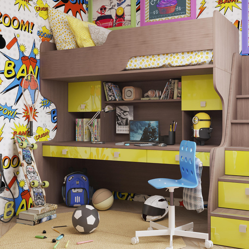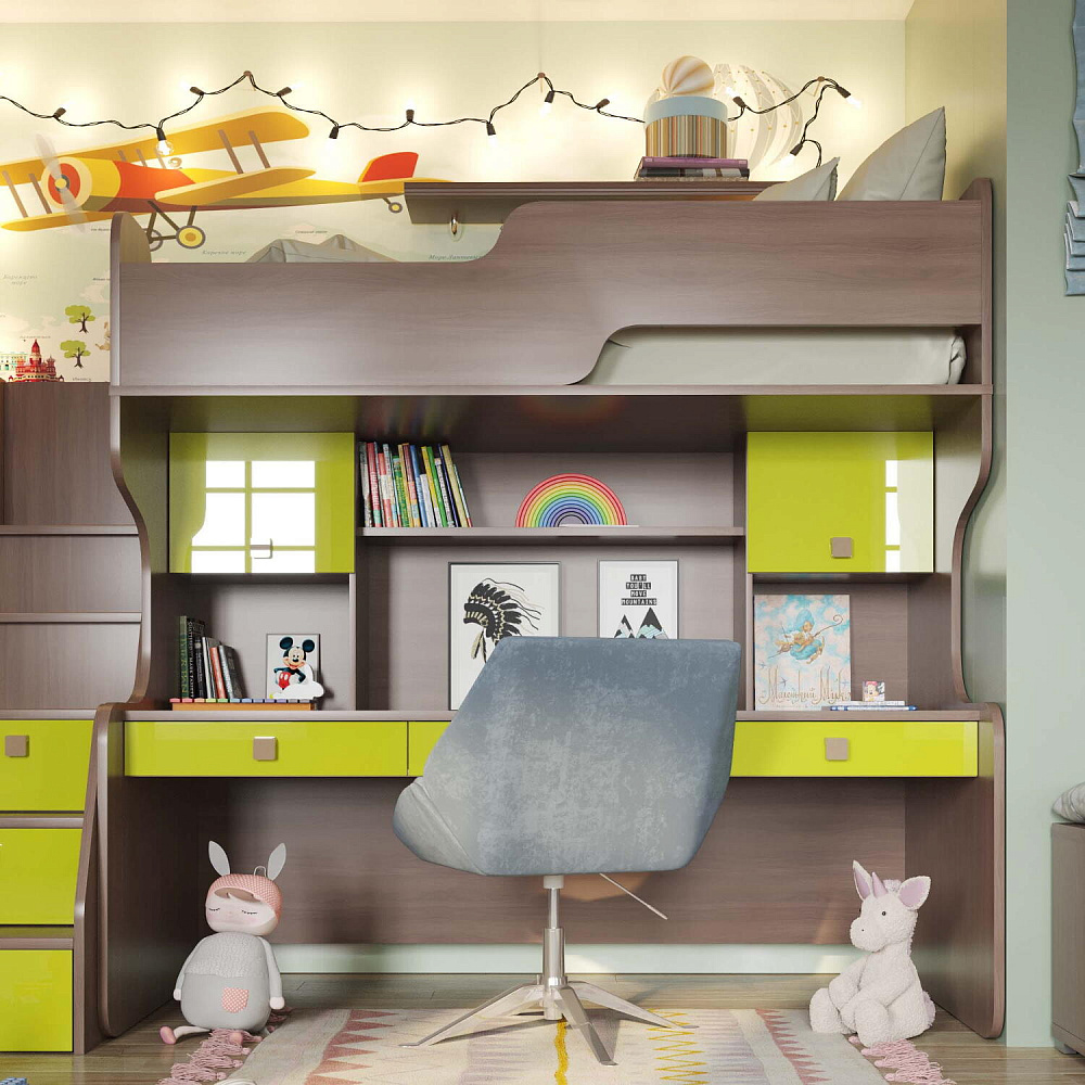 Продуманная двухместная рабочая зона с системой хранения. Под кроватью есть просторная столешница с отверстием для проводов, три выдвижных ящика, два шкафа и открытые полки. Рабочее место будет удобно как для одного, так и для двоих детей, места хватит всем учебным материалам и канцелярии.