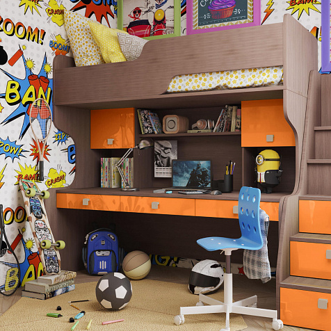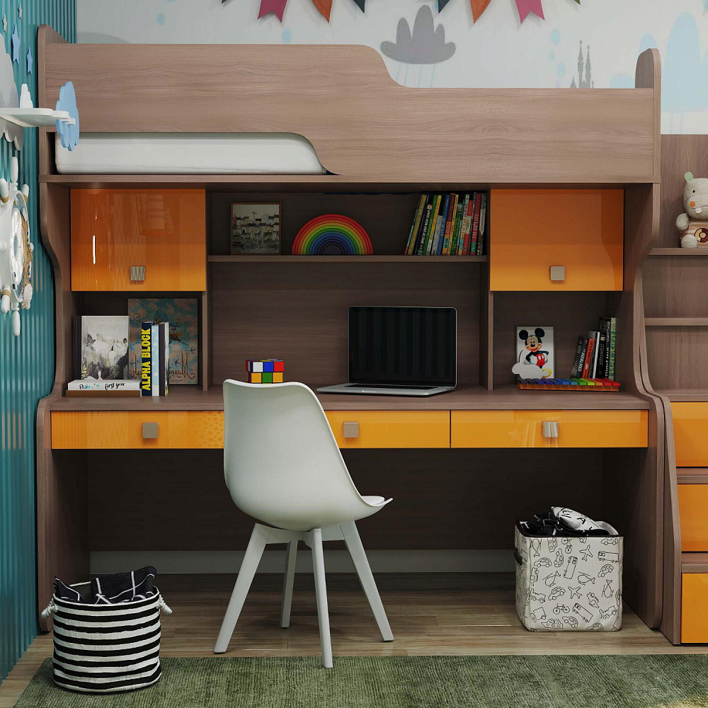 Продуманная двухместная рабочая зона с системой хранения. Под кроватью есть просторная столешница с отверстием для проводов, три выдвижных ящика, два шкафа и открытые полки. Рабочее место будет удобно как для одного, так и для двоих детей, места хватит всем учебным материалам и канцелярии.