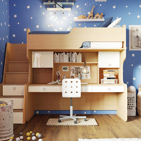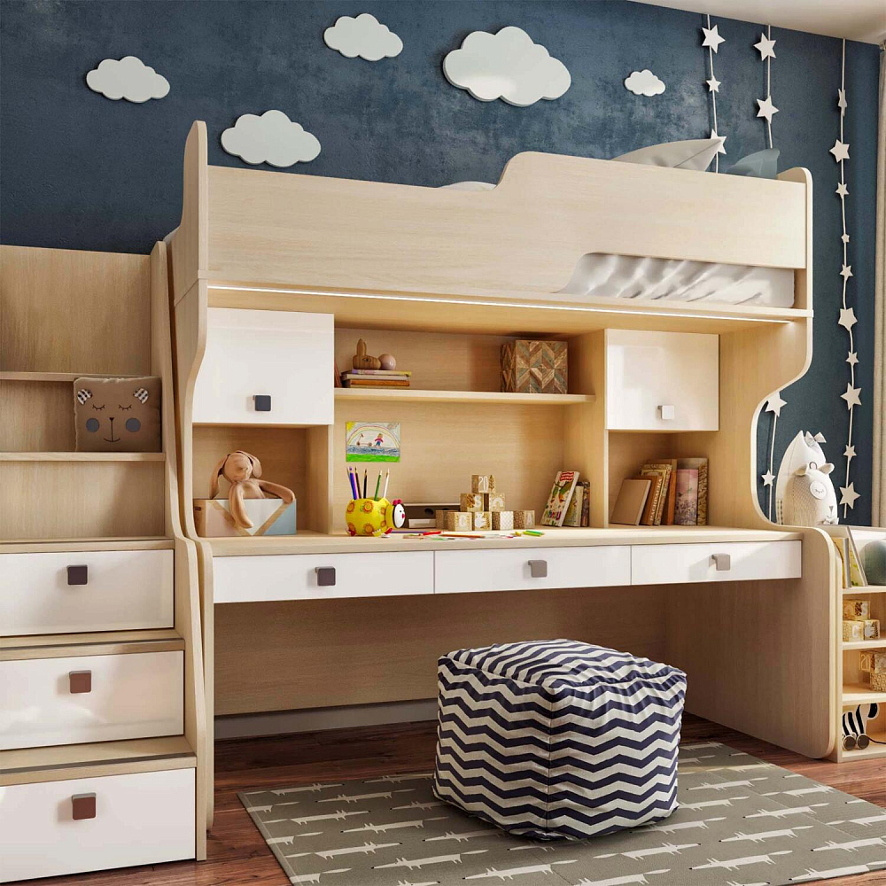 Продуманная двухместная рабочая зона с системой хранения. Под кроватью есть просторная столешница с отверстием для проводов, три выдвижных ящика, два шкафа и открытые полки. Рабочее место будет удобно как для одного, так и для двоих детей, места хватит всем учебным материалам и канцелярии.