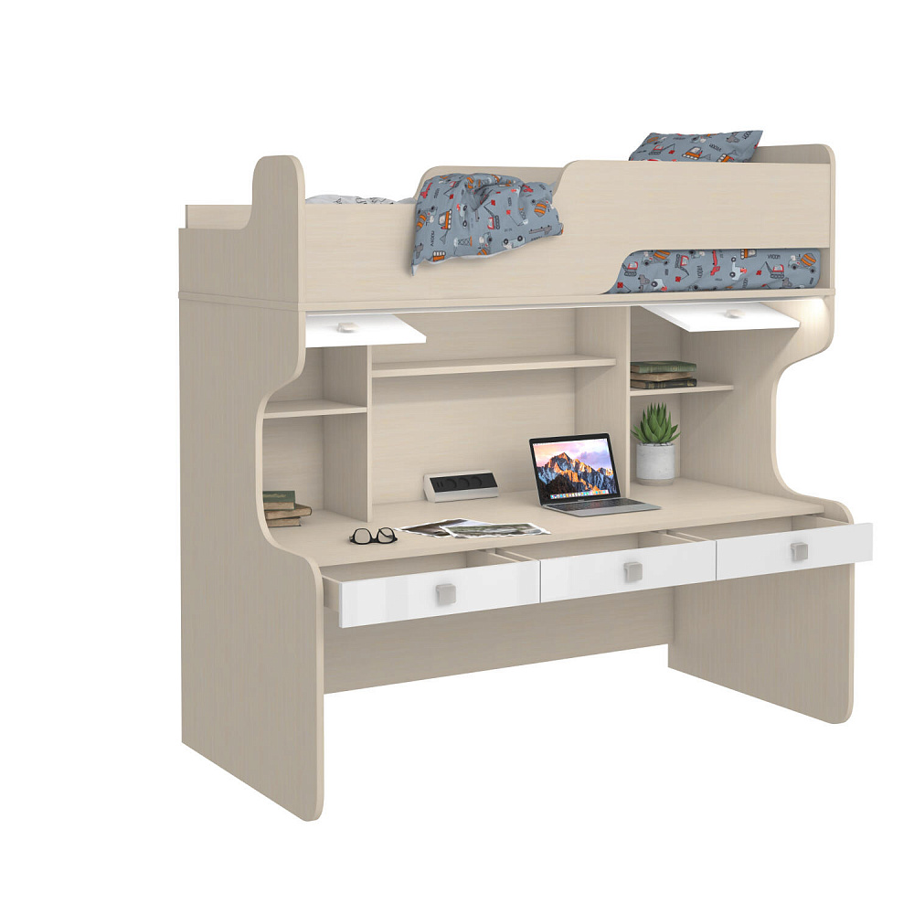 Диодный светильник и блок розеток. В комплект модуля входит диодный светильник с сенсорными выключателем, который крепится к дну спального места и даёт мягкий свет над рабочим столом. Для подключения светильника в комплекте к кровати предусмотрен блок розеток с USB-разъёмами.