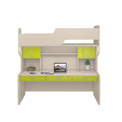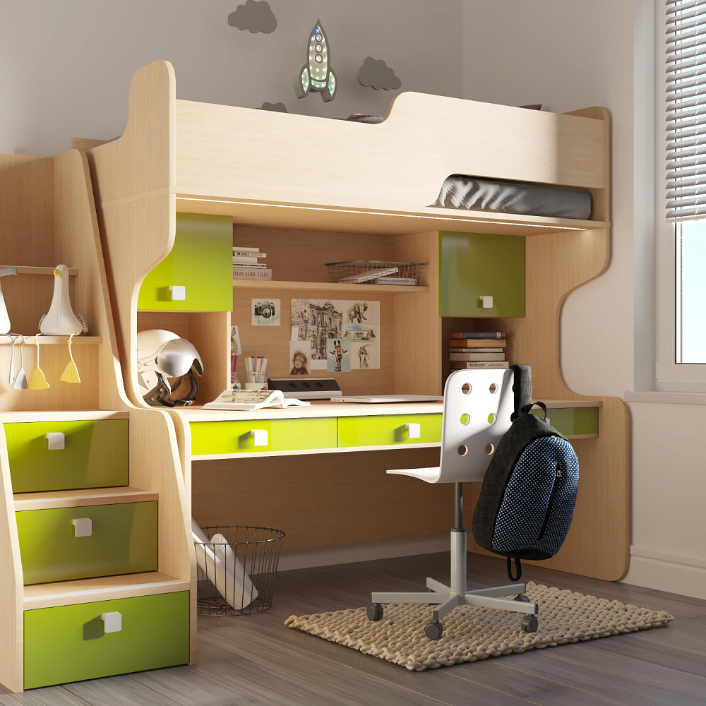 Продуманная двухместная рабочая зона с системой хранения. Под кроватью есть просторная столешница с отверстием для проводов, три выдвижных ящика, два шкафа и открытые полки. Рабочее место будет удобно как для одного, так и для двоих детей, места хватит всем учебным материалам и канцелярии.