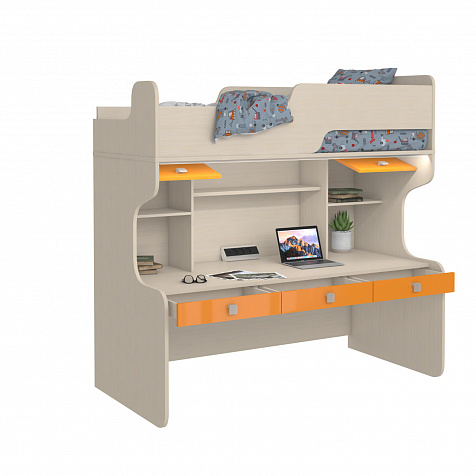 Диодный светильник и блок розеток. В комплект модуля входит диодный светильник с сенсорными выключателем, который крепится к дну спального места и даёт мягкий свет над рабочим столом. Для подключения светильника в комплекте к кровати предусмотрен блок розеток с USB-разъёмами.