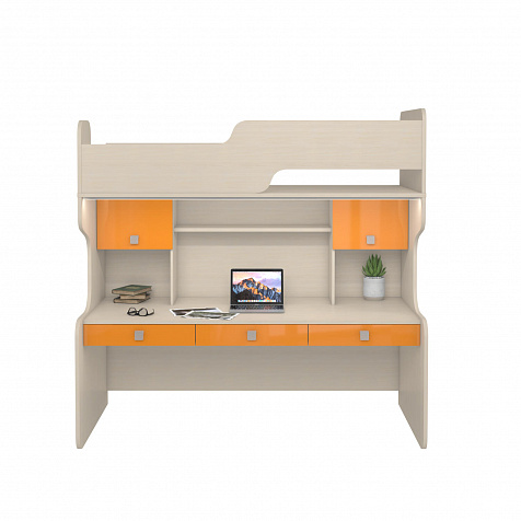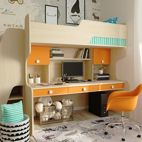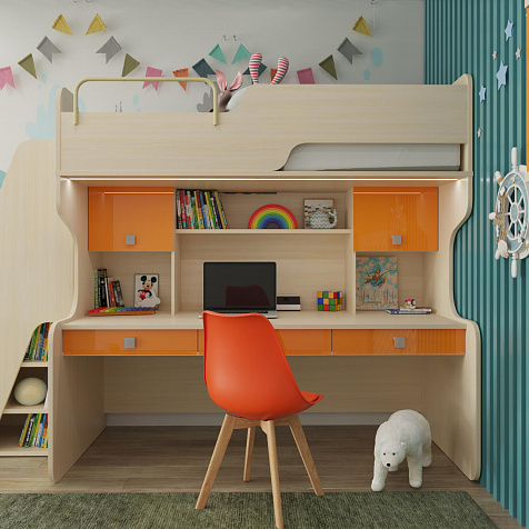 Продуманная двухместная рабочая зона с системой хранения. Под кроватью есть просторная столешница с отверстием для проводов, три выдвижных ящика, два шкафа и открытые полки. Рабочее место будет удобно как для одного, так и для двоих детей, места хватит всем учебным материалам и канцелярии.
