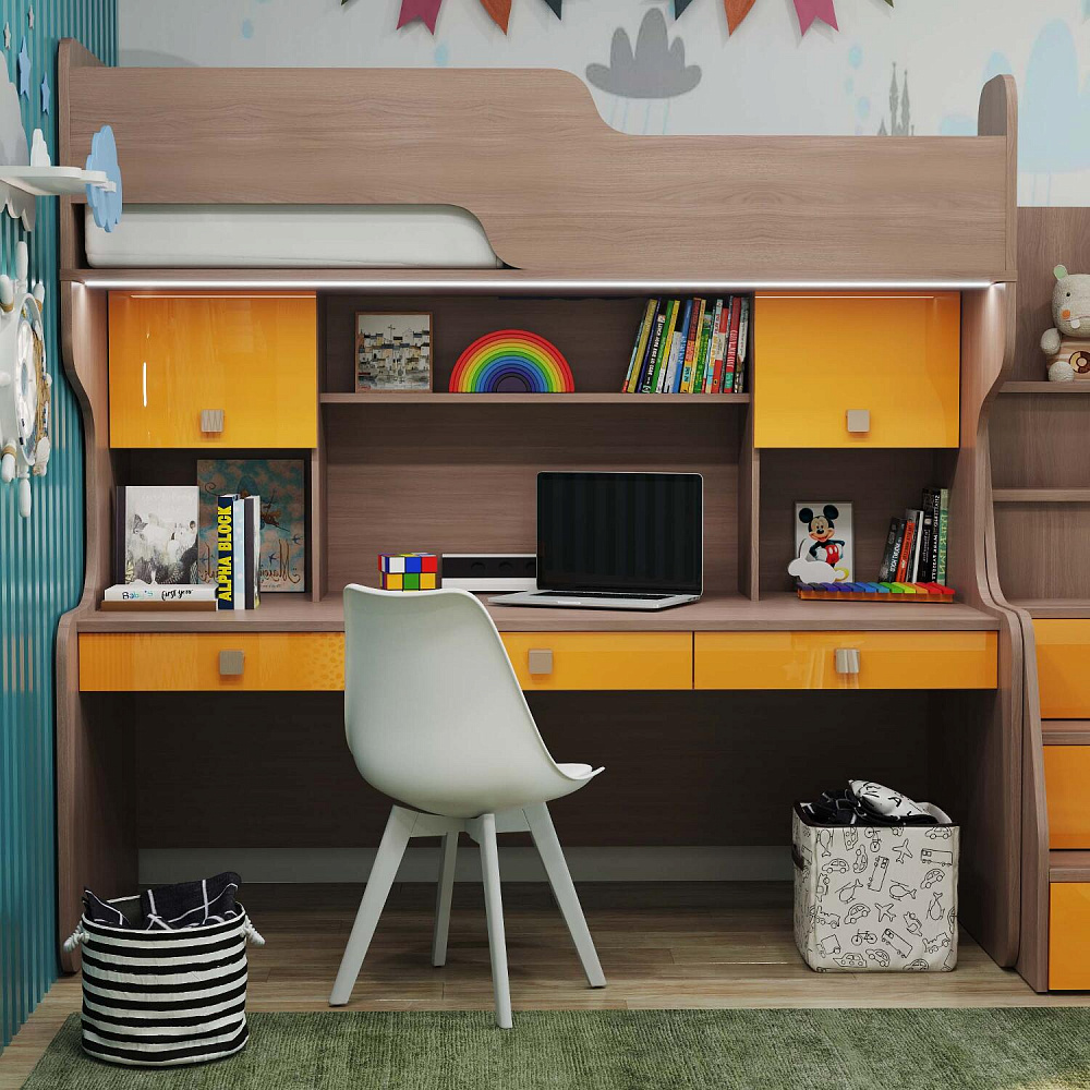 Продуманная двухместная рабочая зона с системой хранения. Под кроватью есть просторная столешница с отверстием для проводов, три выдвижных ящика, два шкафа и открытые полки. Рабочее место будет удобно как для одного, так и для двоих детей, места хватит всем учебным материалам и канцелярии.