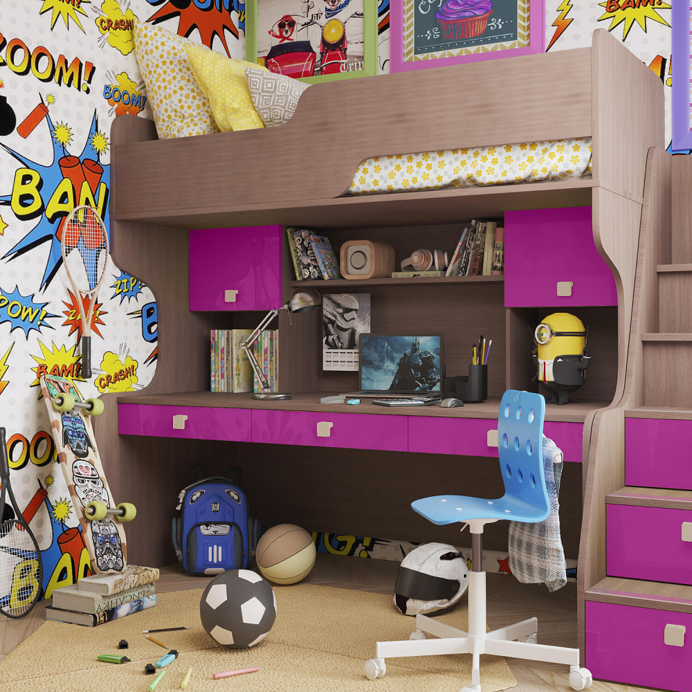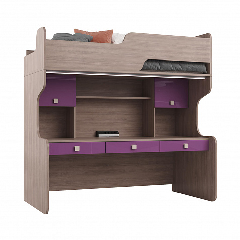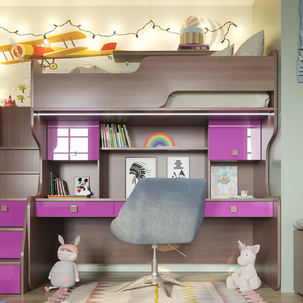 Кровать-чердак «Тиана» — продуманная модель с рабочим столом, удобной системой хранения, диодным светильником и блоком розеток в комплекте. Функциональная кровать понравится как детям, так и их родителям — она значительно экономит место в комнате для игр и активных занятий.