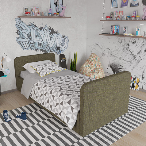 - Обивка из ткани. Высокое изголовье, изножье и каркас кровати обиты практичной тканью, позволяя оформить уютное спальное место.