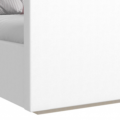 - Обивка из экокожи. Высокое изголовье, изножье и каркас кровати обиты высококачественной экокожей, позволяя оформить уютное спальное место.