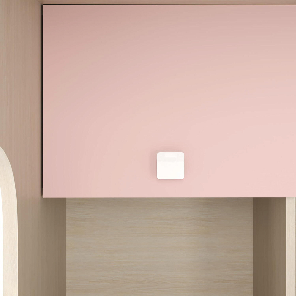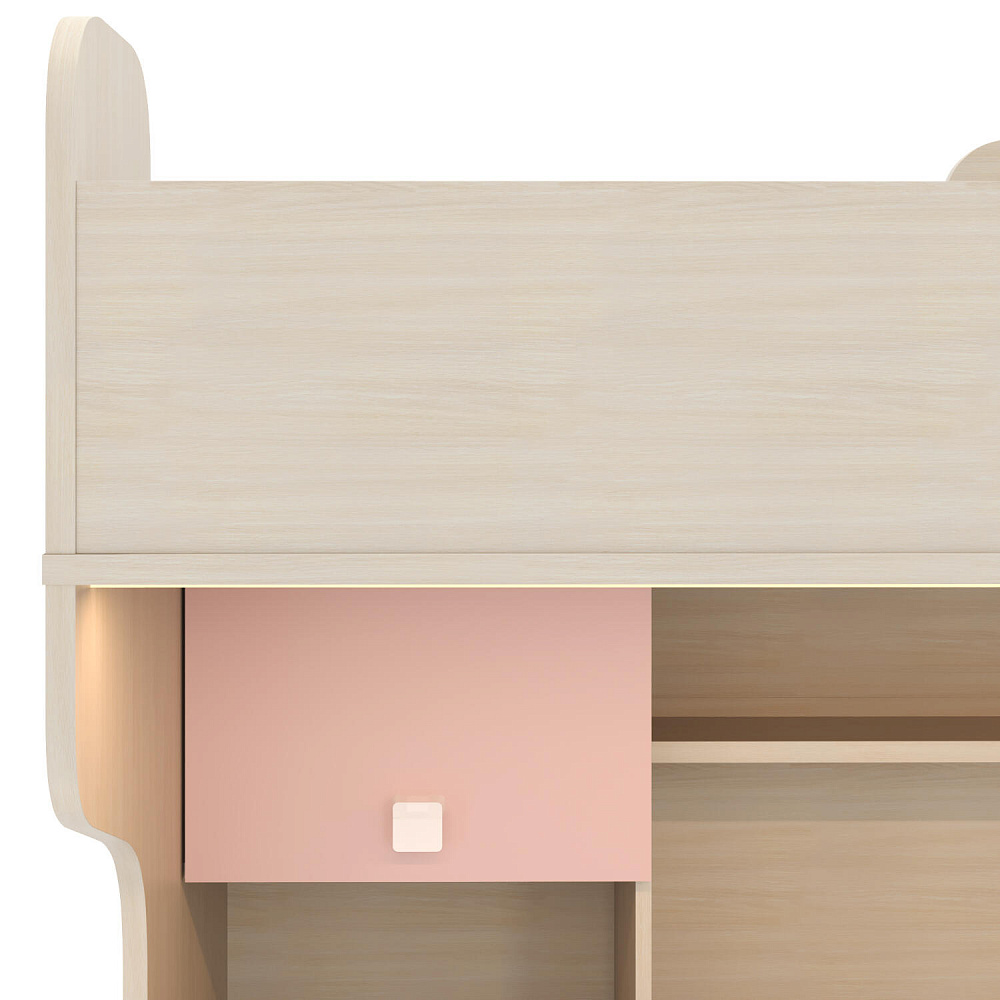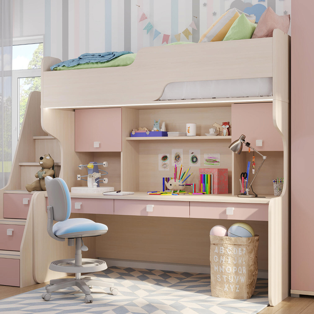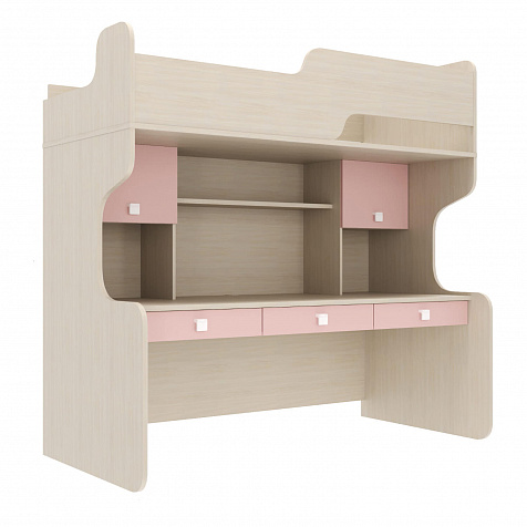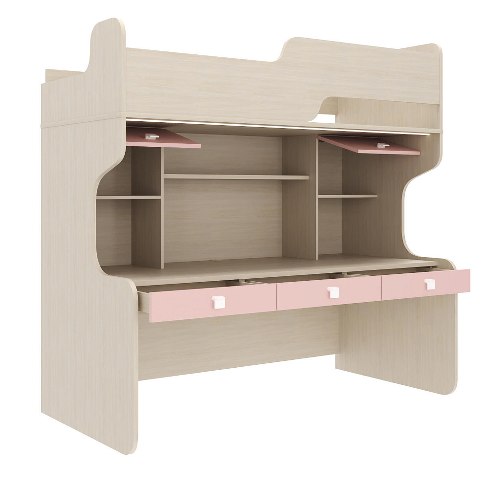 Продуманная двухместная рабочая зона с системой хранения. Под кроватью есть просторная столешница с отверстием для проводов, три выдвижных ящика, два шкафа и открытые полки. Рабочее место будет удобно как для одного, так и для двоих детей, места хватит всем учебным материалам и аксессуарам.