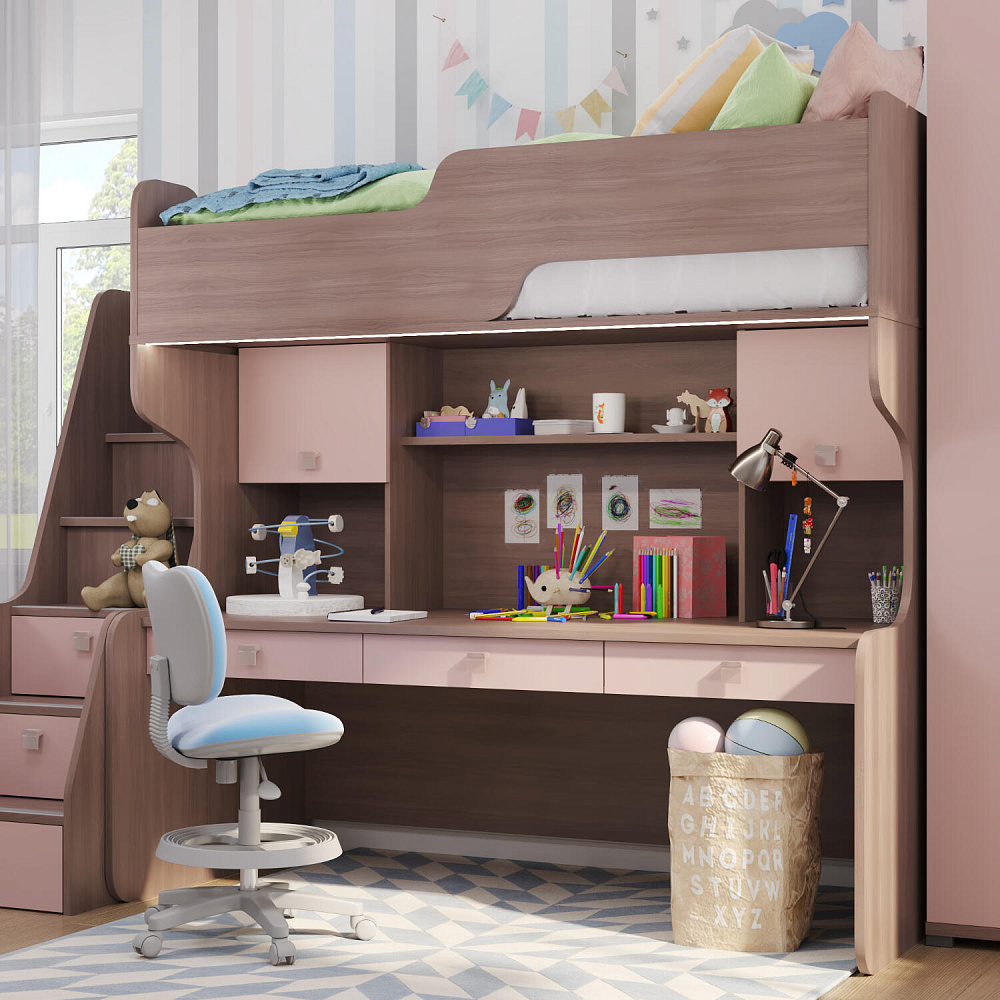 Кровать-чердак «Тиана» с рабочим столом и удобной системой хранения учебных принадлежностей понравится как детям, так и их родителям. Функциональный модуль значительно освободит место в комнате для игр и активных занятий.