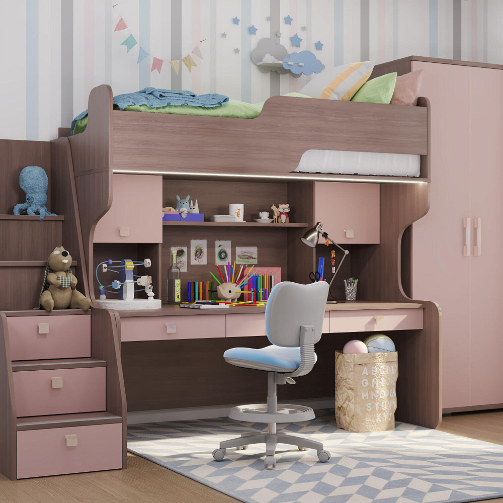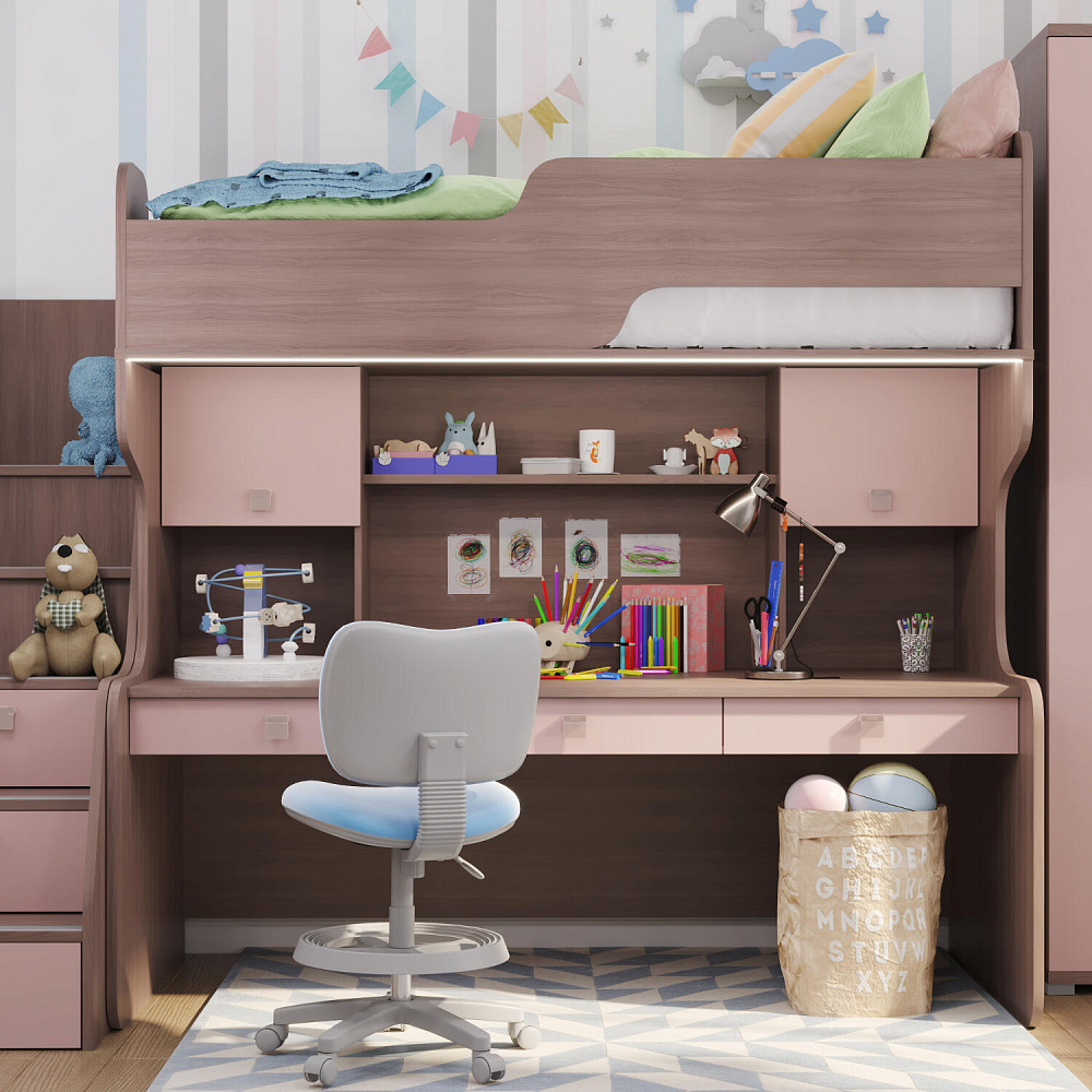 Продуманная двухместная рабочая зона с системой хранения. Под кроватью есть просторная столешница с отверстием для проводов, три выдвижных ящика, два шкафа и открытые полки. Рабочее место будет удобно как для одного, так и для двоих детей, места хватит всем учебным материалам и аксессуарам.