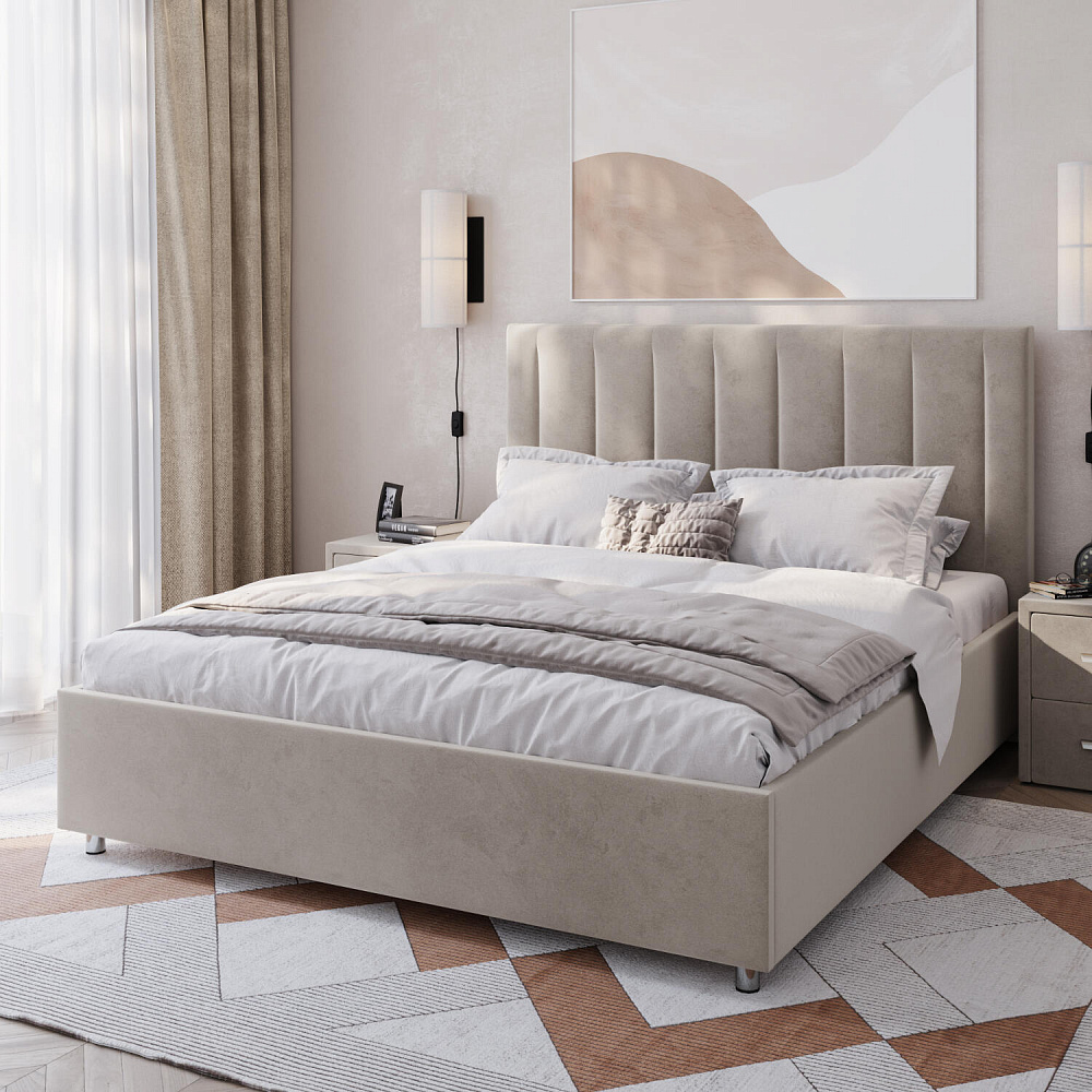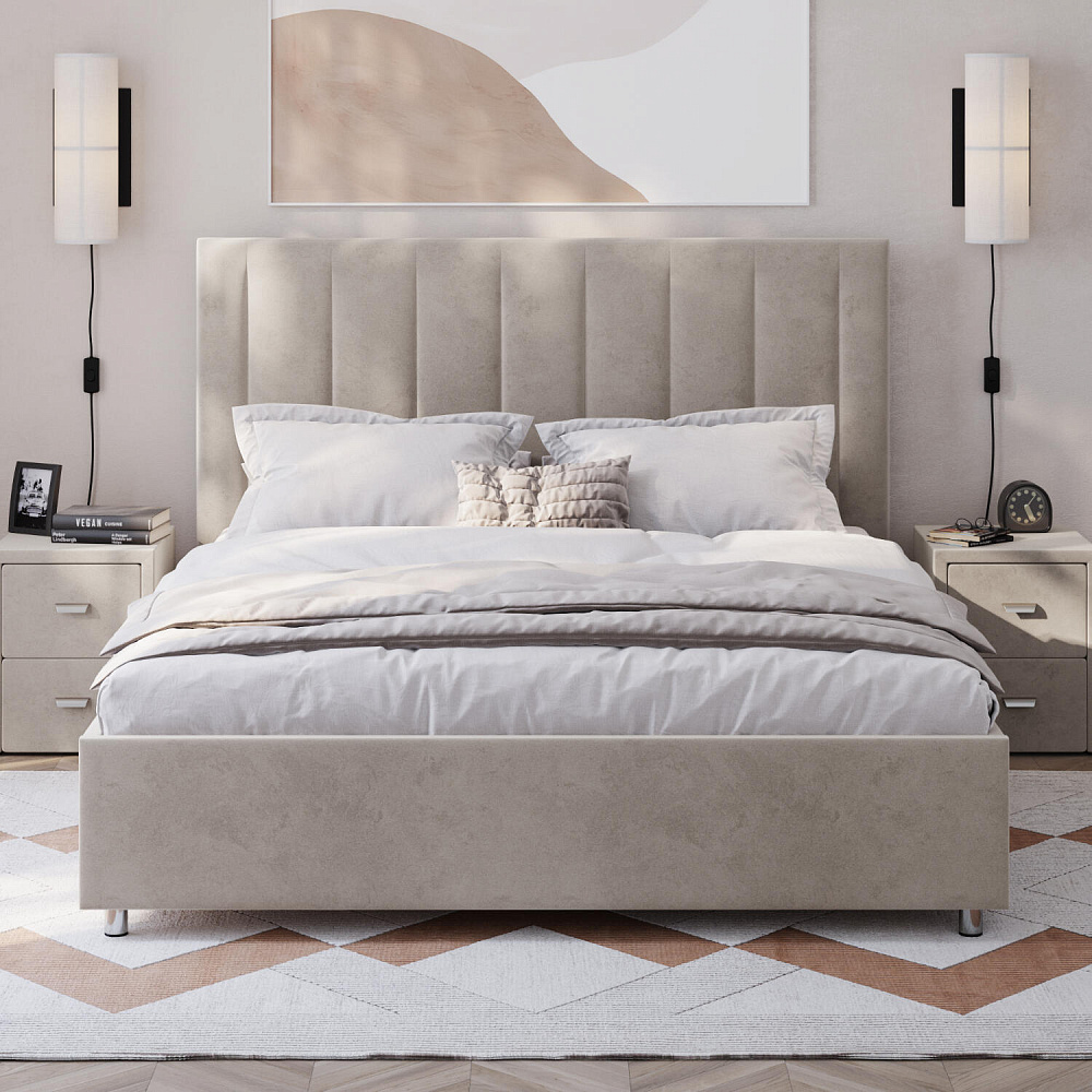 Мягкая кровать «Альфа» будет смотреться в интерьере спальни стильно и лаконично. Высокое изголовье модели украшено вертикальными строчками. Ортопедическое основание и правильно подобранный матрас обеспечат комфортный отдых и здоровый сон.