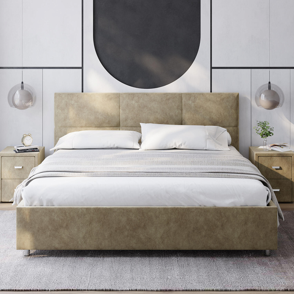Кровать «Альба» — гармоничное сочетание стильного дизайна и комфорта. Мягкое изголовье с декором в виде прямоугольной строчки выглядит эффектно и создаёт ощущение уюта. Модель также поможет сэкономить пространство спальни благодаря вместительному бельевому коробу под решёткой.