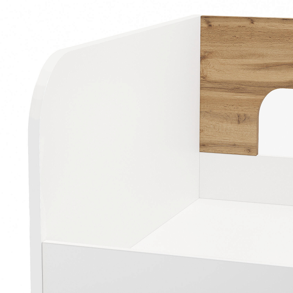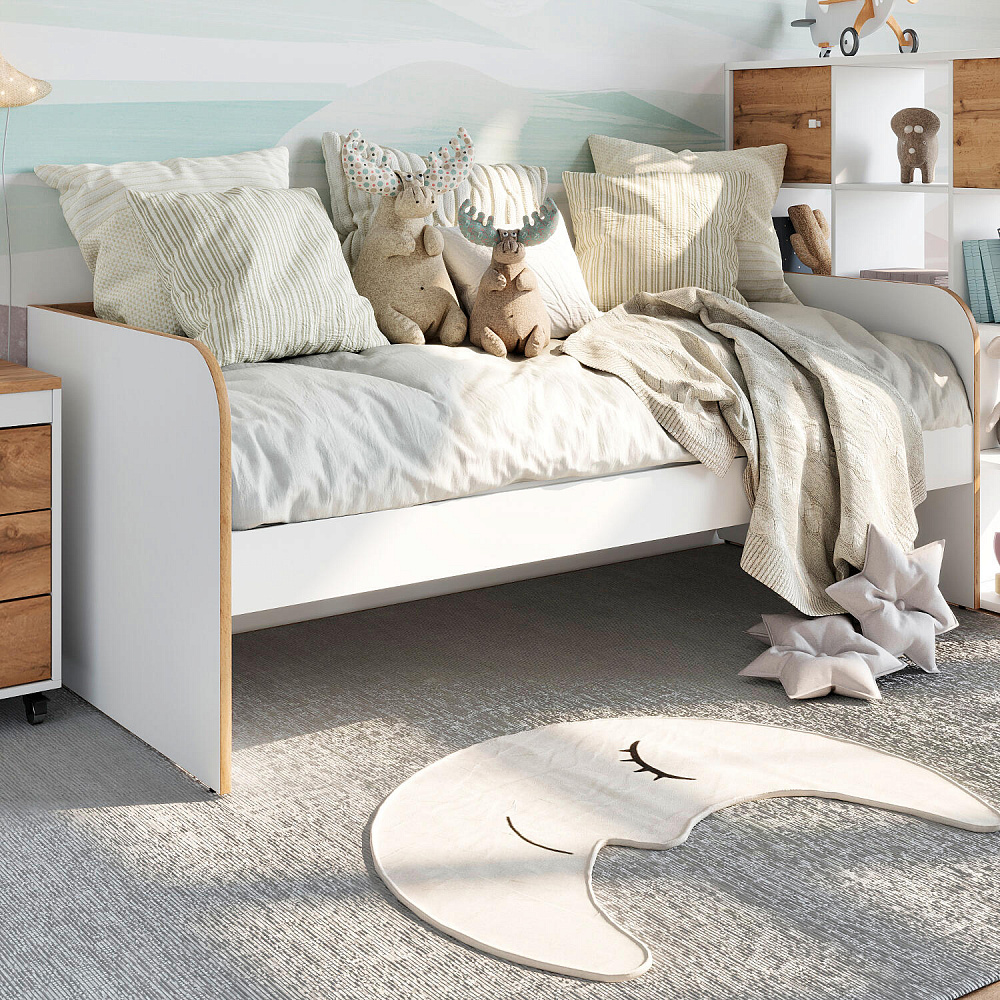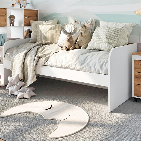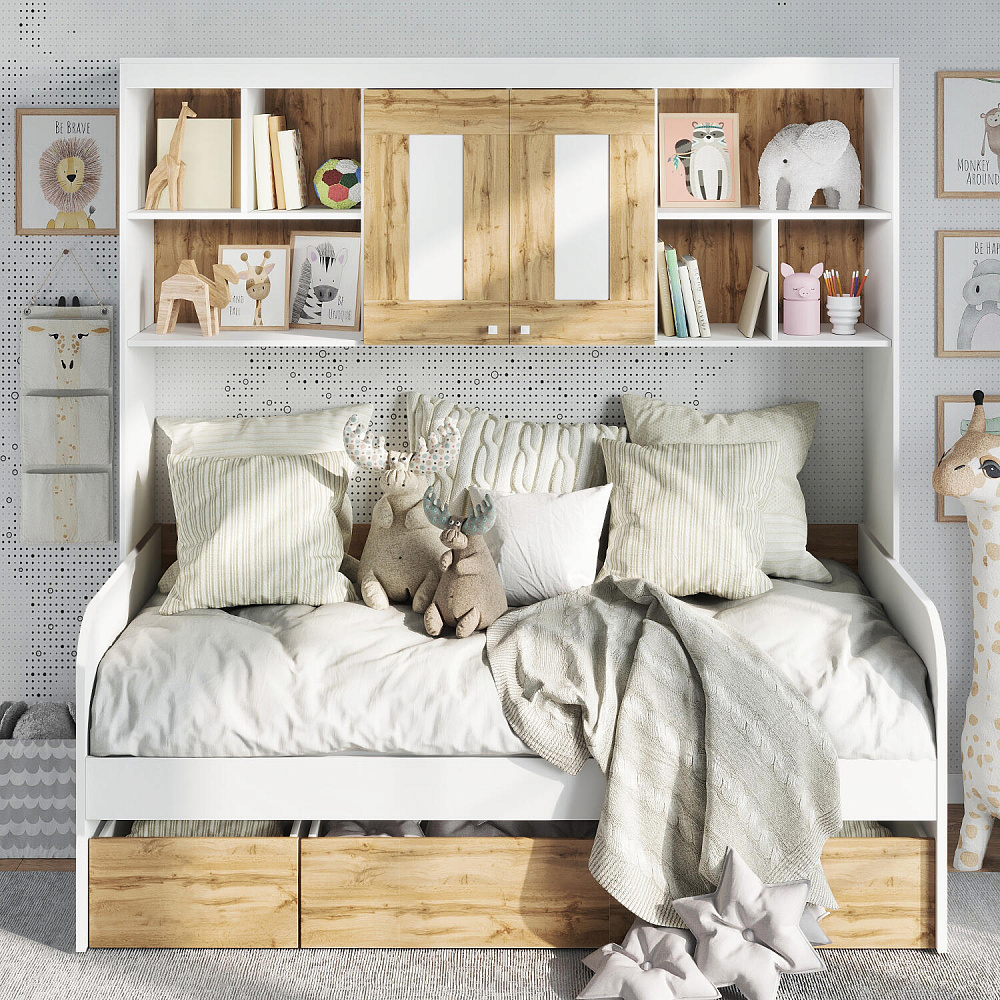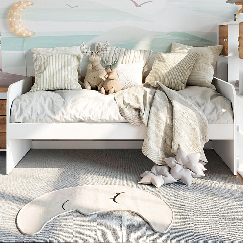 Кровать «Аллегро» займёт центральное место в интерьере детской. Приятное сочетание белых стенок и древесного декора задней панели наполнит пространство комнаты светом и теплом. Продуманные размеры спального места при наличии удобного матраса обеспечат максимально спокойный и полезный отдых вашего ребёнка. При необходимости базовая функциональность кровати может быть расширена за счёт установки под основание дополнительных модулей.