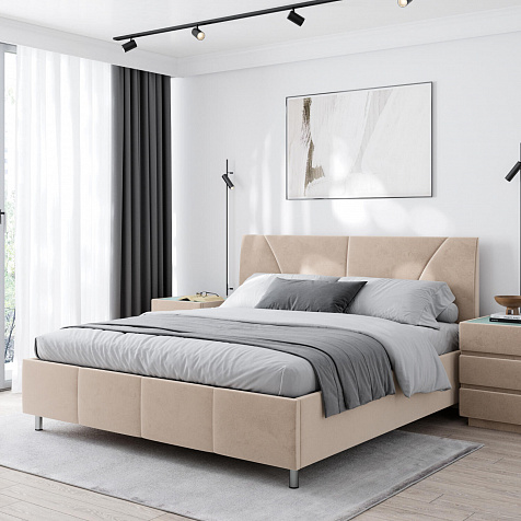 Мягкая кровать «Каролина» для тех, кому важен здоровый сон и эстетичный вид мебели. Дизайн отличается диагональными и прямыми строчками и слегка изогнутым изголовьем. Возвышение на ножках добавит в интерьер динамики и лёгкости. Кровать также поможет сэкономить пространство квартиры благодаря вместительному бельевому коробу под решёткой.