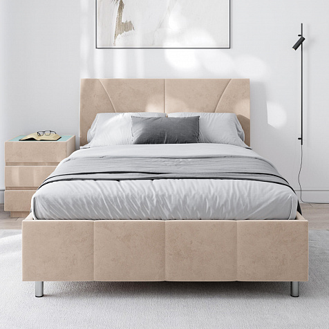 Мягкая кровать «Каролина» для тех, кому важен здоровый сон и эстетичный вид мебели. Дизайн отличается диагональными и прямыми строчками и слегка изогнутым изголовьем. Возвышение на ножках добавит в интерьер динамики и лёгкости. Кровать также поможет сэкономить пространство квартиры благодаря вместительному бельевому коробу под решёткой.