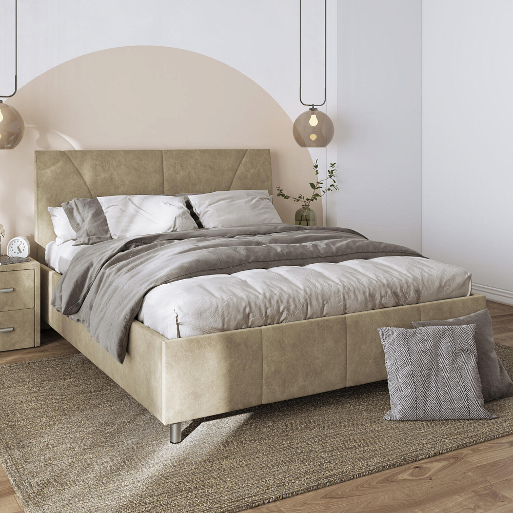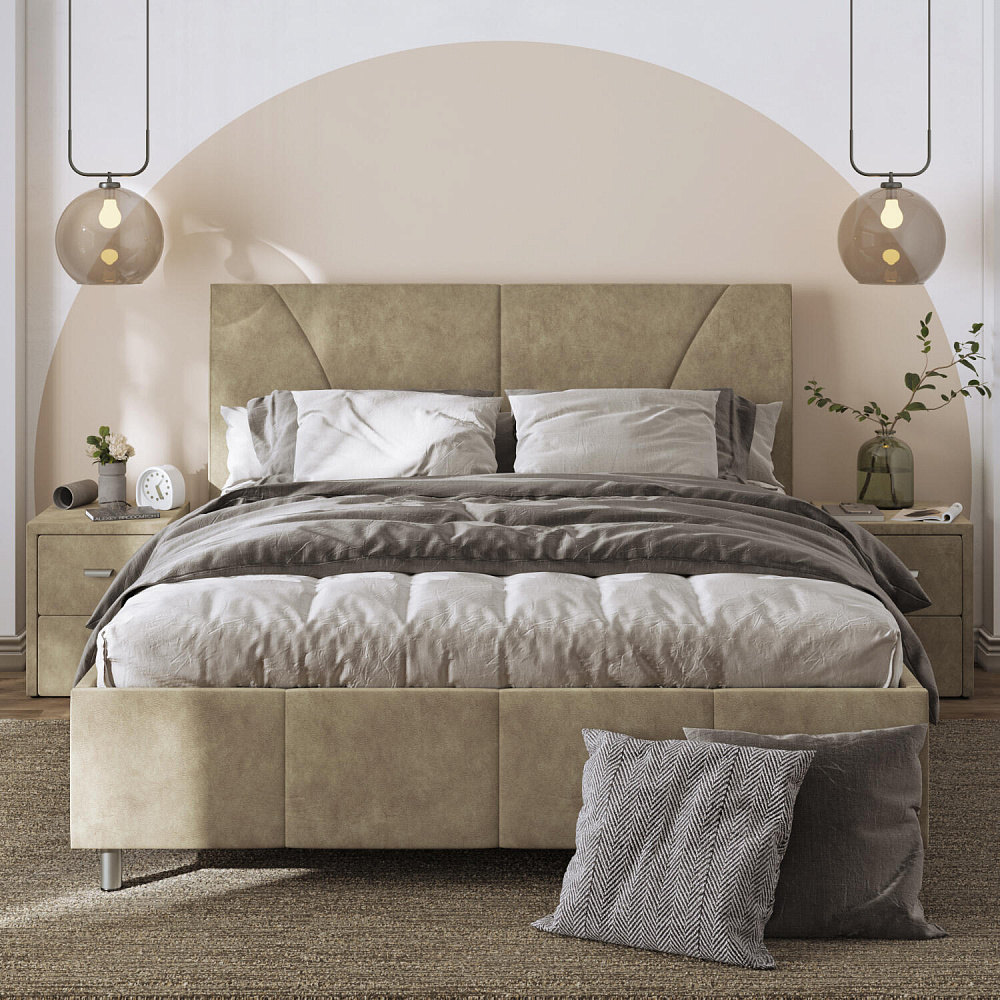 Мягкая кровать «Каролина» для тех, кому важен здоровый сон и эстетичный вид мебели. Дизайн отличается диагональными и прямыми строчками и слегка изогнутым изголовьем. Возвышение на ножках добавит в интерьер динамики и лёгкости. Кровать также поможет сэкономить пространство квартиры благодаря вместительному бельевому коробу под решёткой.