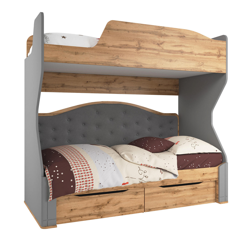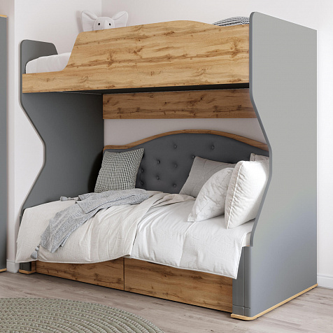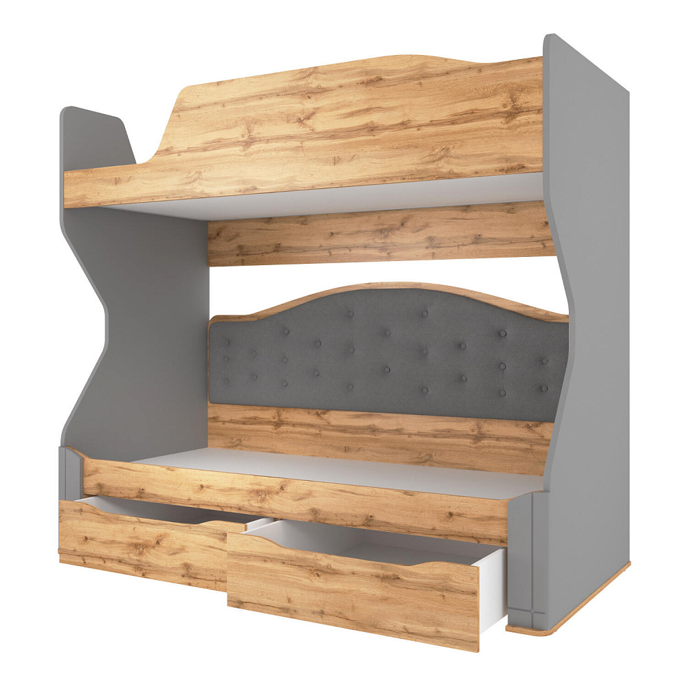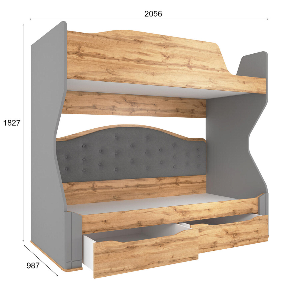 Двухъярусная кровать «Кассия» займёт центральное место в интерьере детской. Приятное сочетание серых стенок, древесного декора панелей наполнит пространство комнаты светом и теплом. Продуманные размеры верхнего и нижнего спального места при наличии удобных матрасов обеспечат максимально спокойный и полезный отдых ваших детей, а выдвижные ящики помогут компактно разместить постельное бельё.