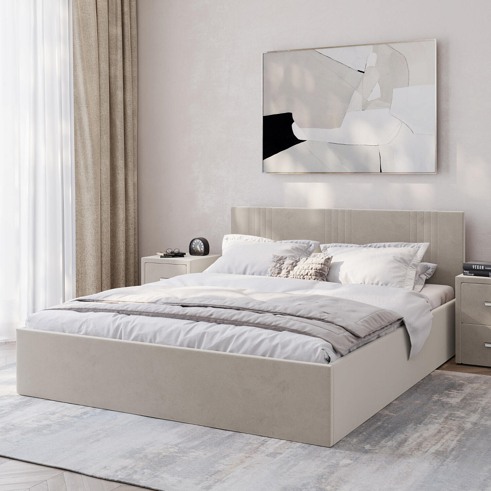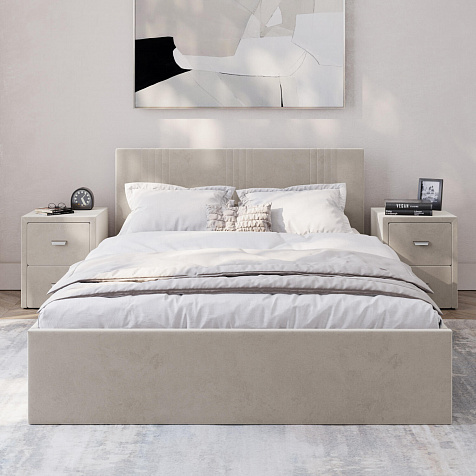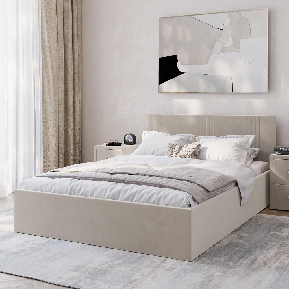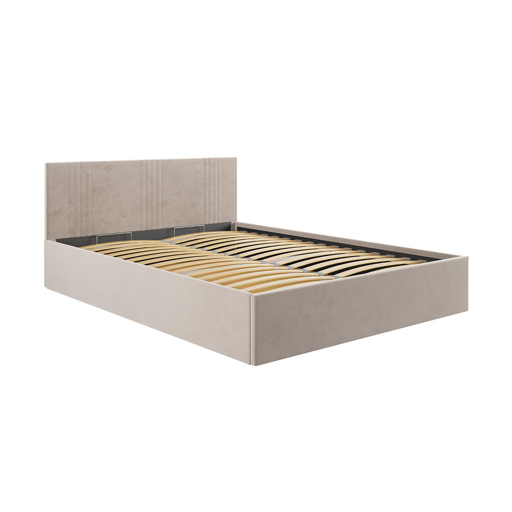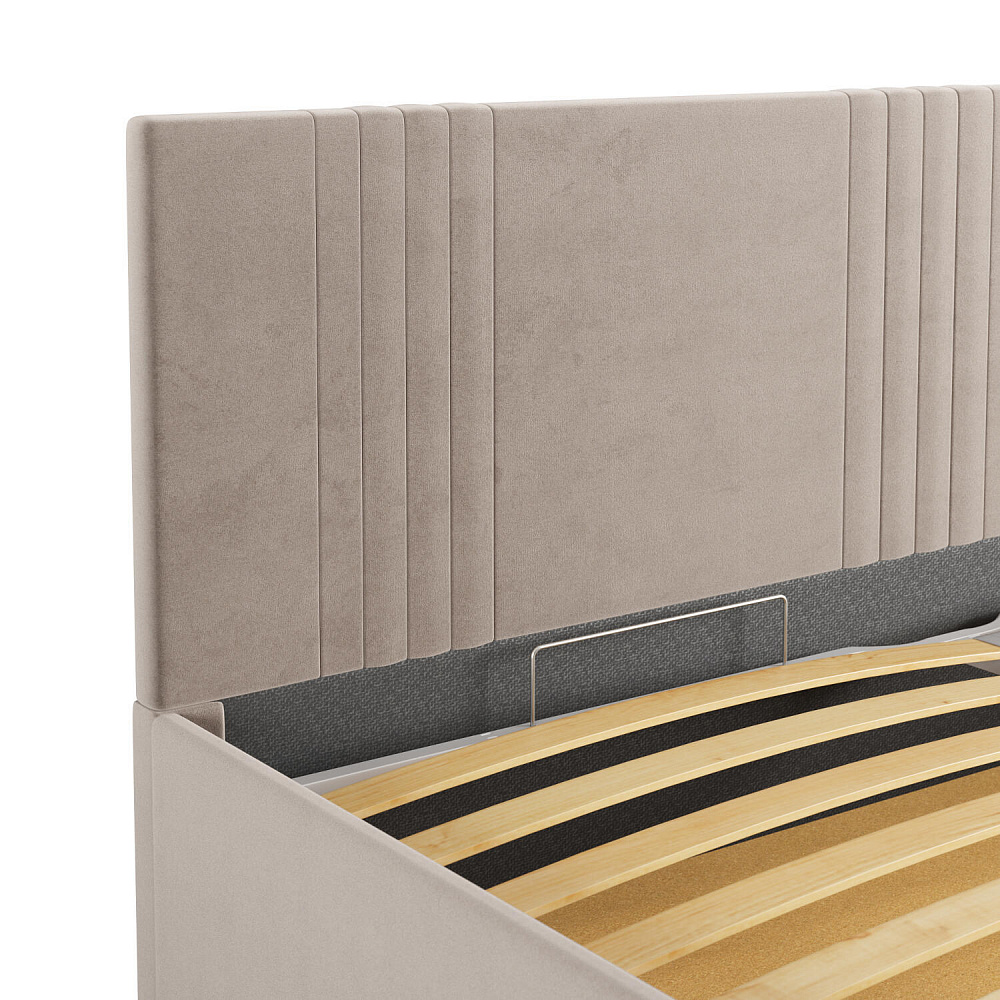 Кровать «Элис» выполнена в мягкой обивке из практичного и износостойкого велюра. Прямая спинка украшена декоративной стежкой, добавляющей стиля и динамики в интерьер. Особо прочный бельевой ящик позволит хранить в кровати даже самые тяжелые предметы и вещи. Надёжное основание и анатомическая решётка на подъёмных газлифтах обеспечат оптимальный уровень комфорта во время сна.