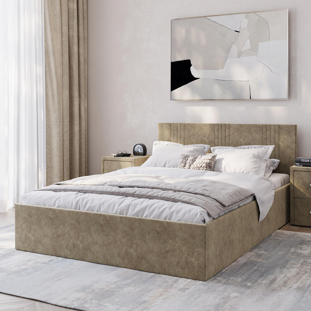 Кровать «Элис» выполнена в мягкой обивке из практичного и износостойкого велюра. Прямая спинка украшена декоративной стежкой, добавляющей стиля и динамики в интерьер. Особо прочный бельевой ящик позволит хранить в кровати даже самые тяжелые предметы и вещи. Надёжное основание и анатомическая решётка на подъёмных газлифтах обеспечат оптимальный уровень комфорта во время сна.